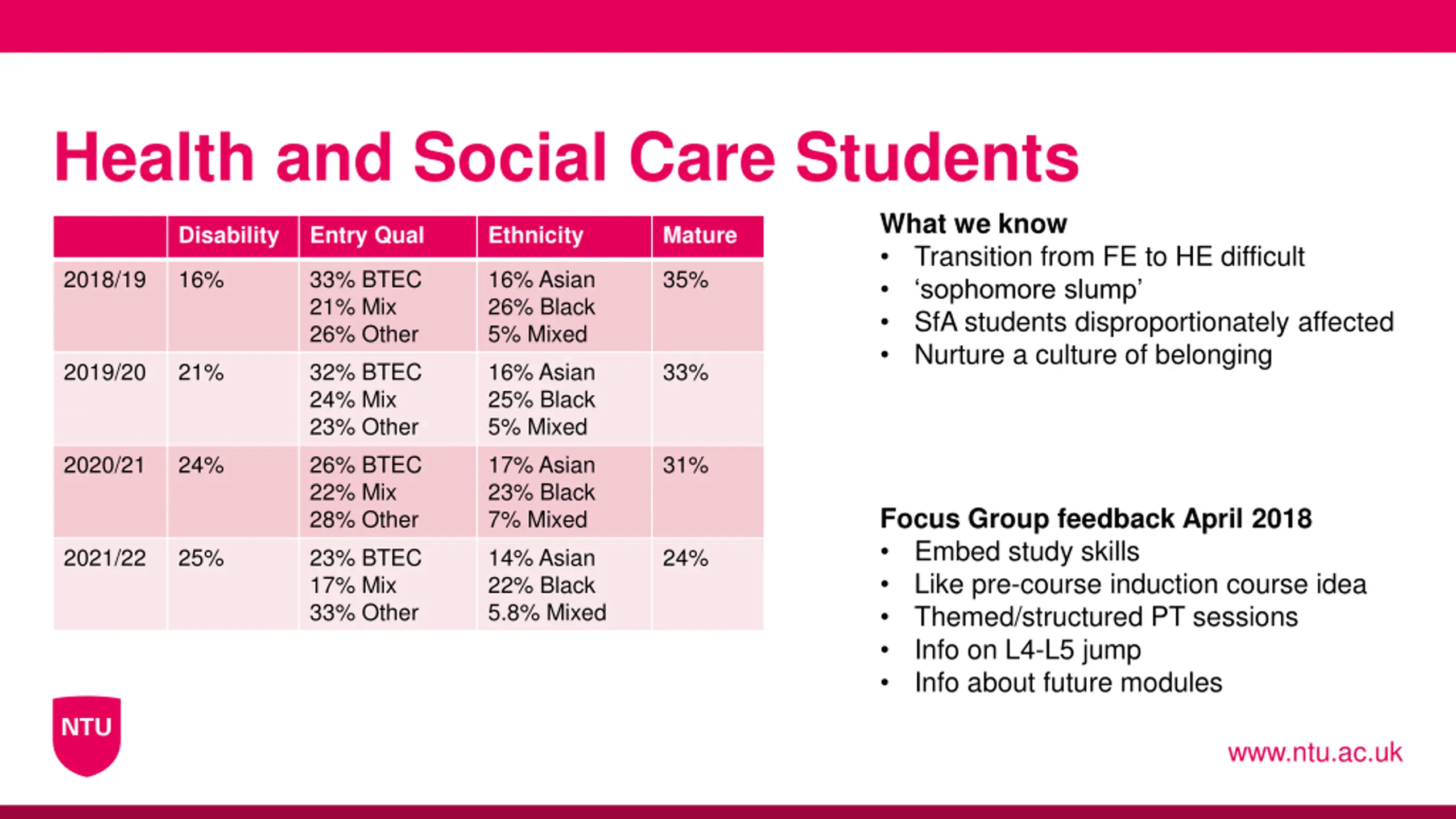 Health and Social Care Students What we know Transition from FE to HE difficult sophomore slump SfA students disproportionately affected Nurture a culture of belonging Disability Entry Qual Ethnicity Mature 2018/19 16% 33% BTEC 21% Mix 26% Other 16% Asian 26% Black 5% Mixed 35% 2019/20 21% 32% BTEC 24% Mix 23% Other 16% Asian 25% Black 5% Mixed 33% 2020/21 24% 26% BTEC 22% Mix 28% Other 17% Asian 23% Black 7% Mixed 31% Focus Group feedback April 2018 Embed study skills Like pre-course induction course idea Themed/structured PT sessions Info on L4-L5 jump Info about future modules 2021/22 25% 23% BTEC 17% Mix 33% Other 14% Asian 22% Black 5.8% Mixed 24% www.ntu.ac.uk