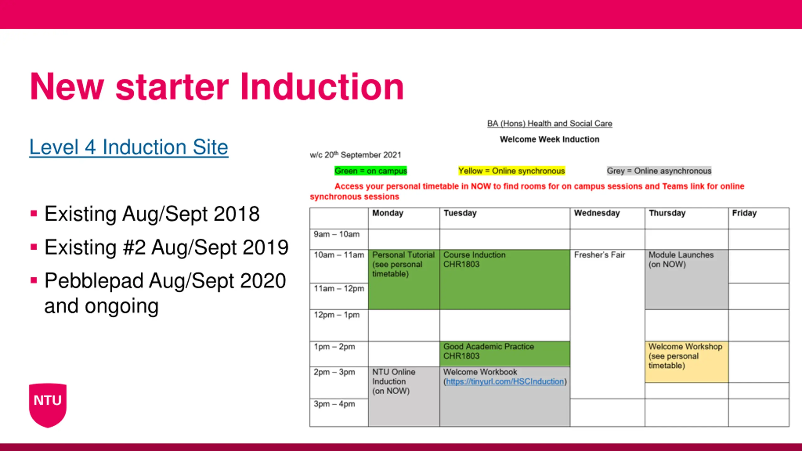 New starter Induction Level 4 Induction Site Existing Aug/Sept 2018 Existing #2 Aug/Sept 2019 Pebblepad Aug/Sept 2020 and ongoing www.ntu.ac.uk