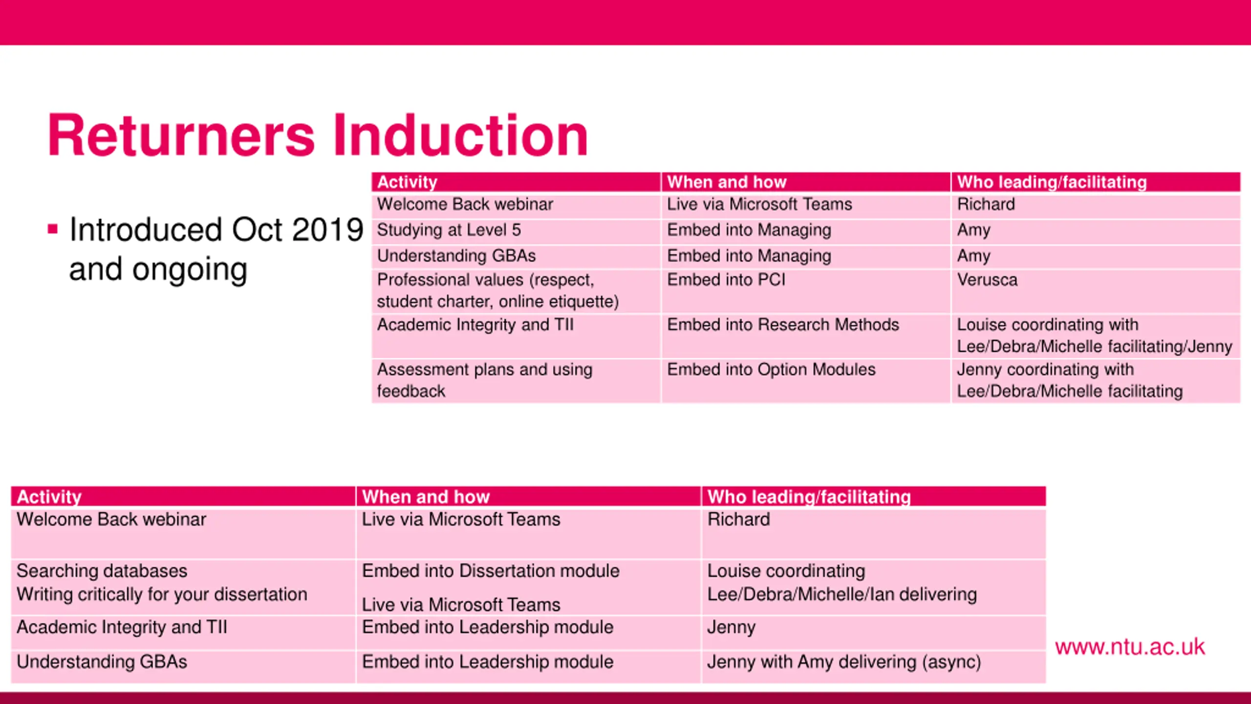 Returners Induction Activity Welcome Back webinar Studying at Level 5 Understanding GBAs Professional values (respect, student charter, online etiquette) Academic Integrity and TII When and how Live via Microsoft Teams Embed into Managing Embed into Managing Embed into PCI Who leading/facilitating Richard Amy Amy Verusca Introduced Oct 2019 and ongoing Embed into Research Methods Louise coordinating with Lee/Debra/Michelle facilitating/Jenny Jenny coordinating with Lee/Debra/Michelle facilitating Assessment plans and using feedback Embed into Option Modules Activity Welcome Back webinar When and how Live via Microsoft Teams Who leading/facilitating Richard Searching databases Writing critically for your dissertation Embed into Dissertation module Louise coordinating Lee/Debra/Michelle/Ian delivering Live via Microsoft Teams Embed into Leadership module Academic Integrity and TII Jenny www.ntu.ac.uk Understanding GBAs Embed into Leadership module Jenny with Amy delivering (async)