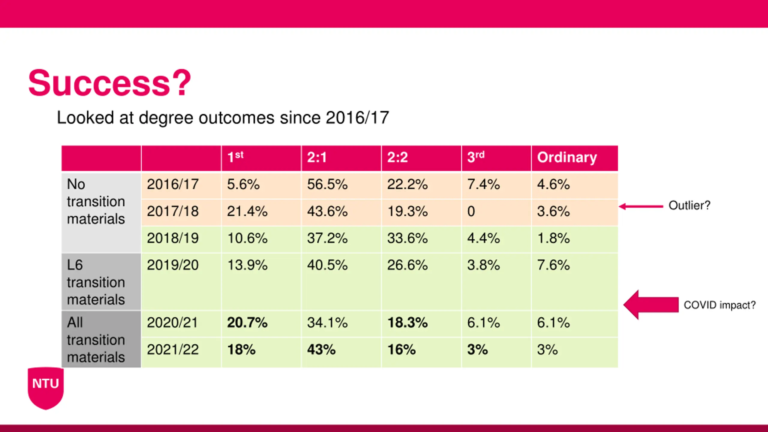 Success? Looked at degree outcomes since 2016/17 1st 2:1 2:2 3rd Ordinary No transition materials 2016/17 5.6% 56.5% 22.2% 7.4% 4.6% Outlier? 2017/18 21.4% 43.6% 19.3% 0 3.6% 2018/19 10.6% 37.2% 33.6% 4.4% 1.8% L6 transition materials All transition materials 2019/20 13.9% 40.5% 26.6% 3.8% 7.6% COVID impact? 2020/21 34.1% 6.1% 6.1% 20.7% 18.3% 2021/22 3% 18% 43% 16% 3%