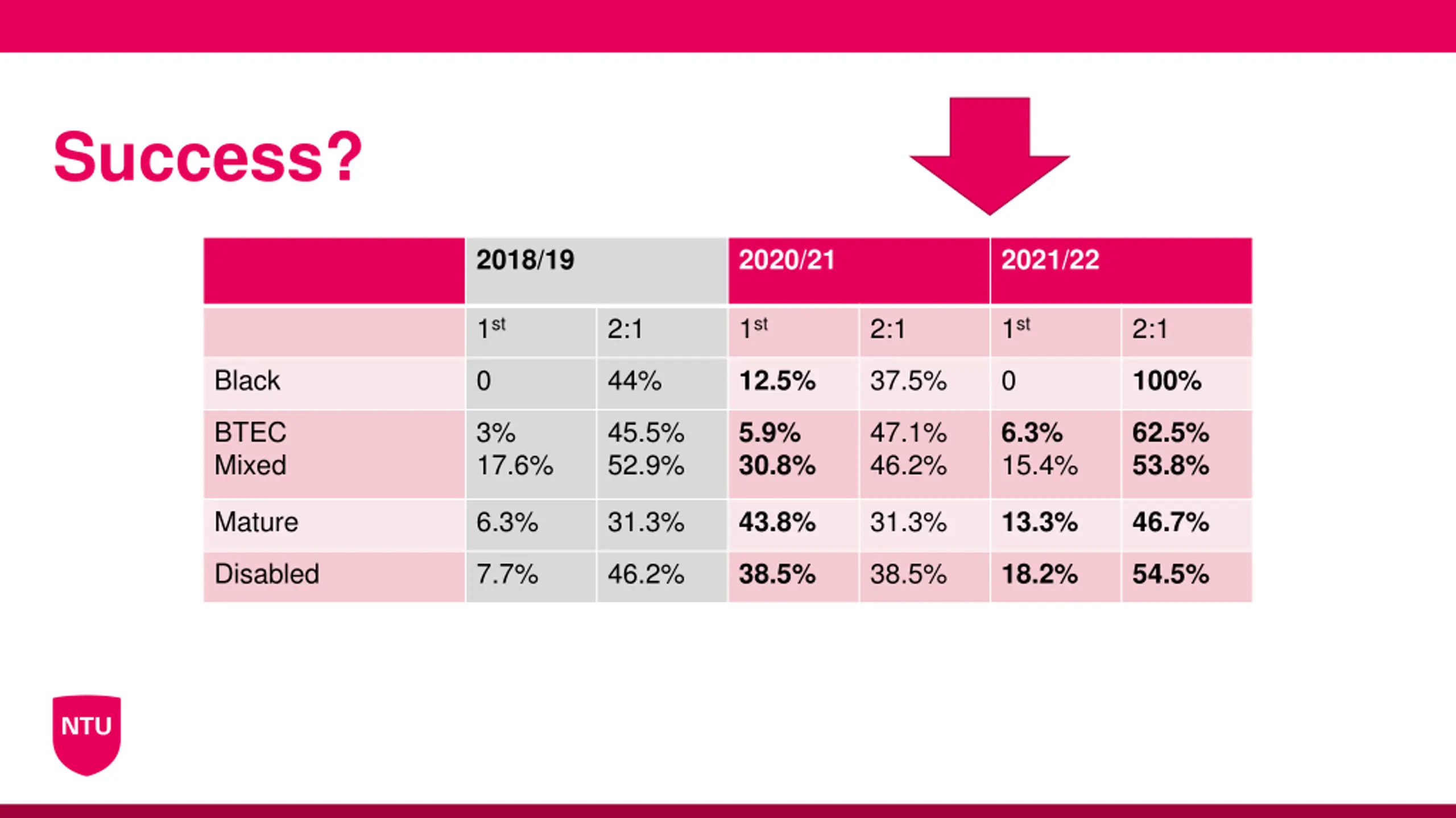 Success? 2018/19 2020/21 2021/22 1st 2:1 1st 2:1 1st 2:1 Black 0 44% 37.5% 0 12.5% 100% BTEC Mixed 3% 17.6% 45.5% 52.9% 47.1% 46.2% 5.9% 30.8% 6.3% 15.4% 62.5% 53.8% Mature 6.3% 31.3% 31.3% 43.8% 13.3% 46.7% Disabled 7.7% 46.2% 38.5% 38.5% 18.2% 54.5%