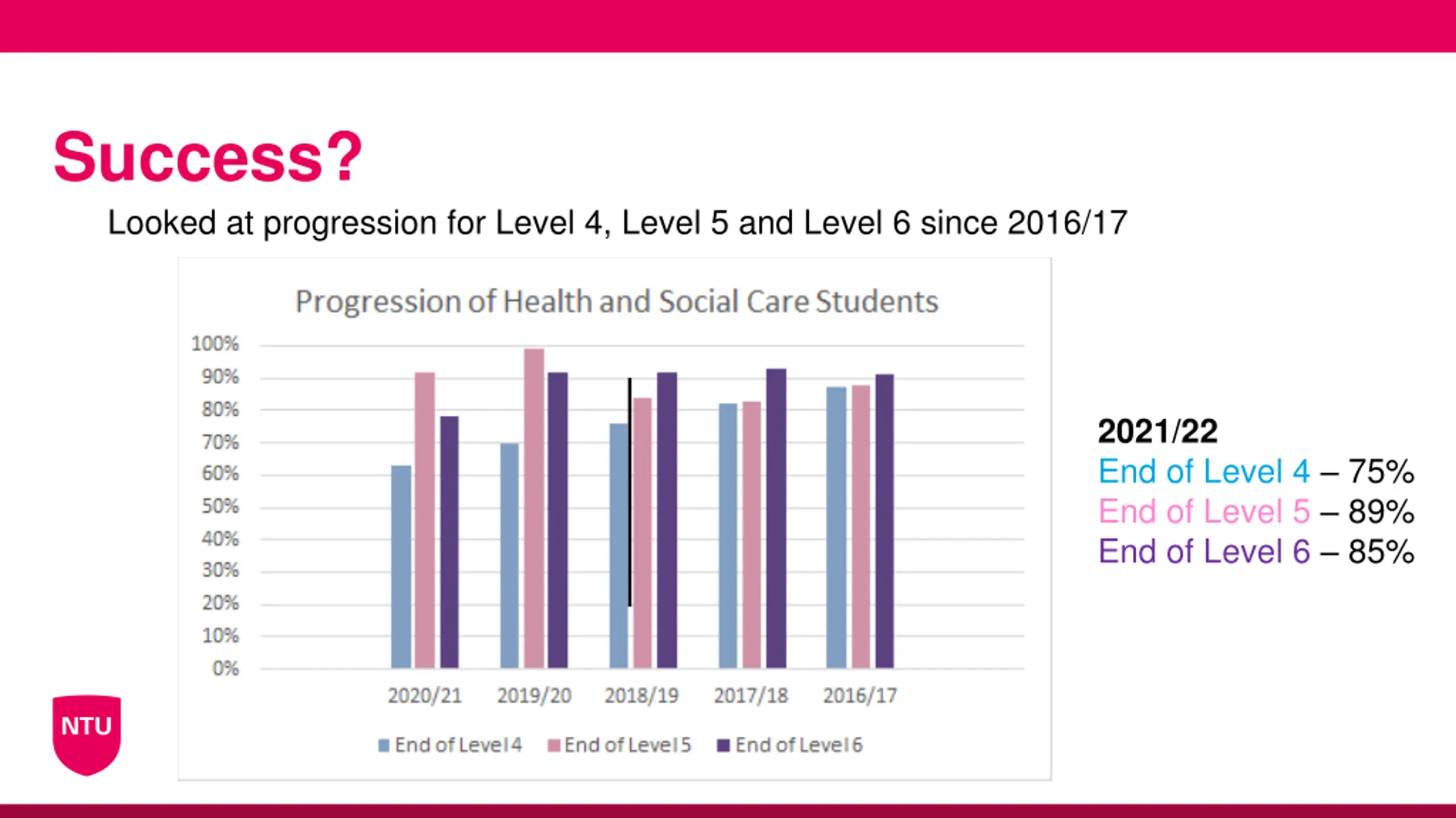 Success? Looked at progression for Level 4, Level 5 and Level 6 since 2016/17 2021/22 End of Level 4 75% End of Level 5 89% End of Level 6 85%