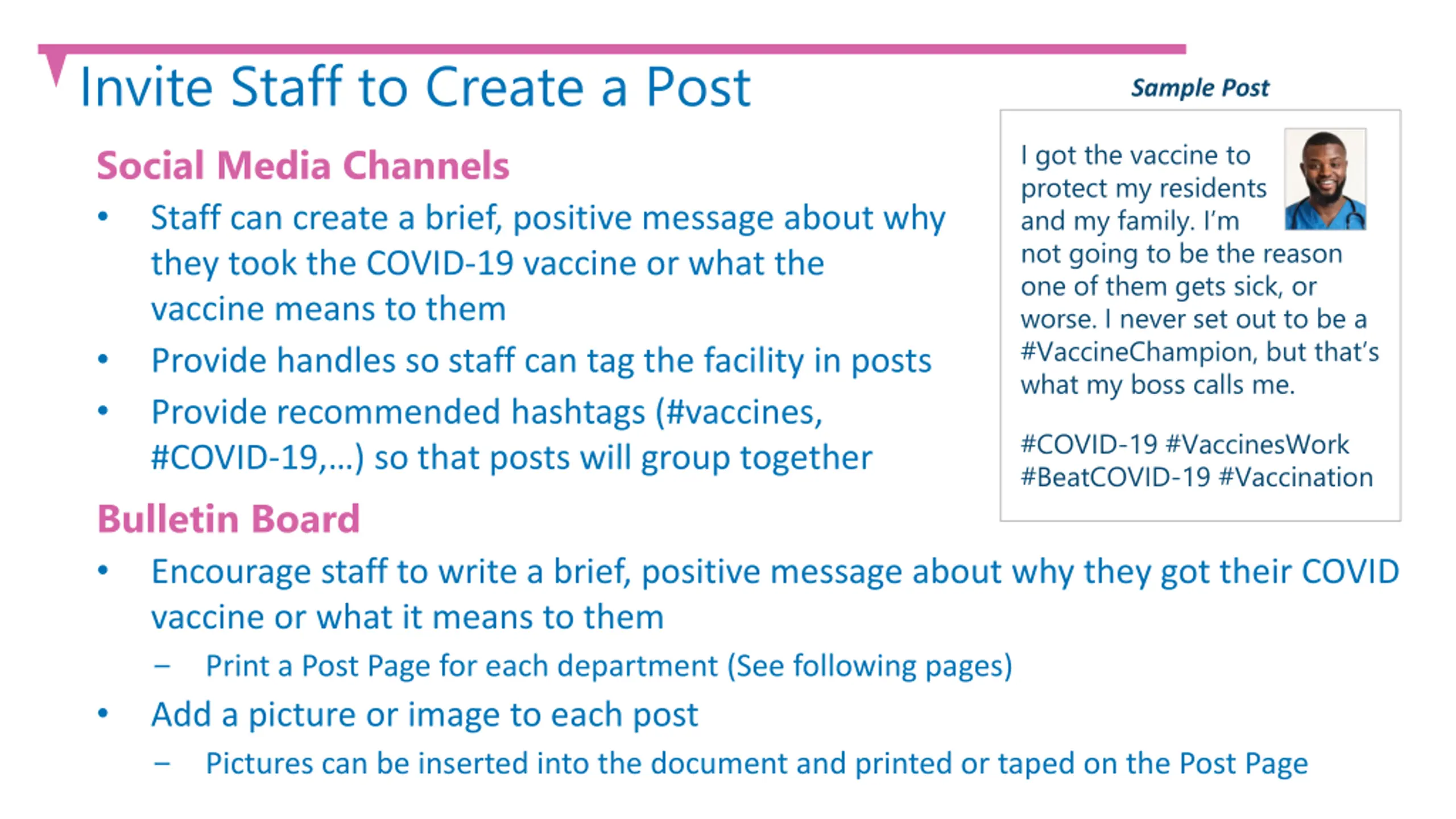 Invite Staff to Create a Post Social Media Channels Staff can create a brief, positive message about why they took the COVID-19 vaccine or what the vaccine means to them Provide handles so staff can tag the facility in posts Provide recommended hashtags (#vaccines, #COVID-19, ) so that posts will group together Bulletin Board Encourage staff to write a brief, positive message about why they got their COVID vaccine or what it means to them Print a Post Page for each department (See following pages) Add a picture or image to each post Pictures can be inserted into the document and printed or taped on the Post Page Sample Post I got the vaccine to protect my residents and my family. I m not going to be the reason one of them gets sick, or worse. I never set out to be a #VaccineChampion, but that s what my boss calls me. #COVID-19 #VaccinesWork #BeatCOVID-19 #Vaccination