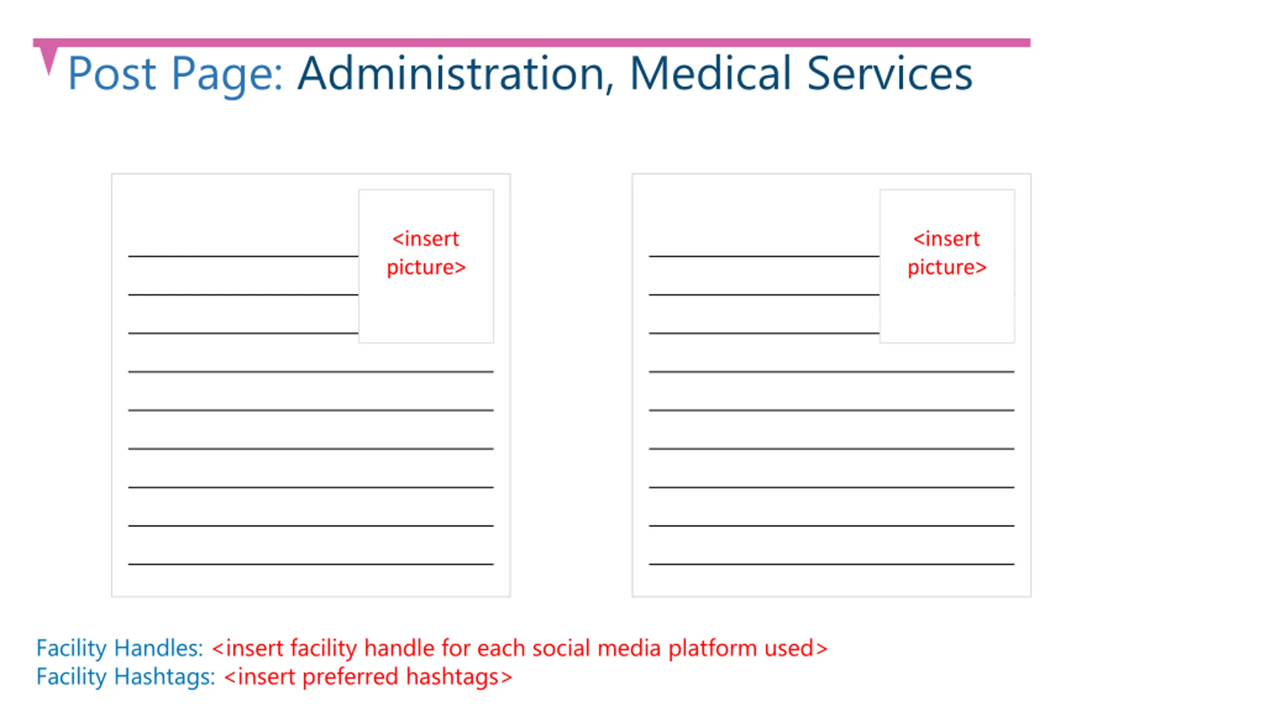Post Page: Administration, Medical Services <insert picture> <insert picture> Facility Handles: <insert facility handle for each social media platform used> Facility Hashtags: <insert preferred hashtags>