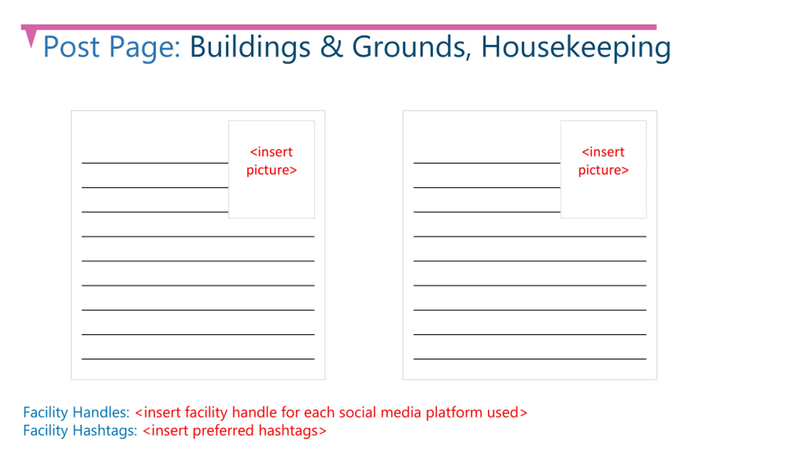 Post Page: Buildings & Grounds, Housekeeping <insert picture> <insert picture> Facility Handles: <insert facility handle for each social media platform used> Facility Hashtags: <insert preferred hashtags>