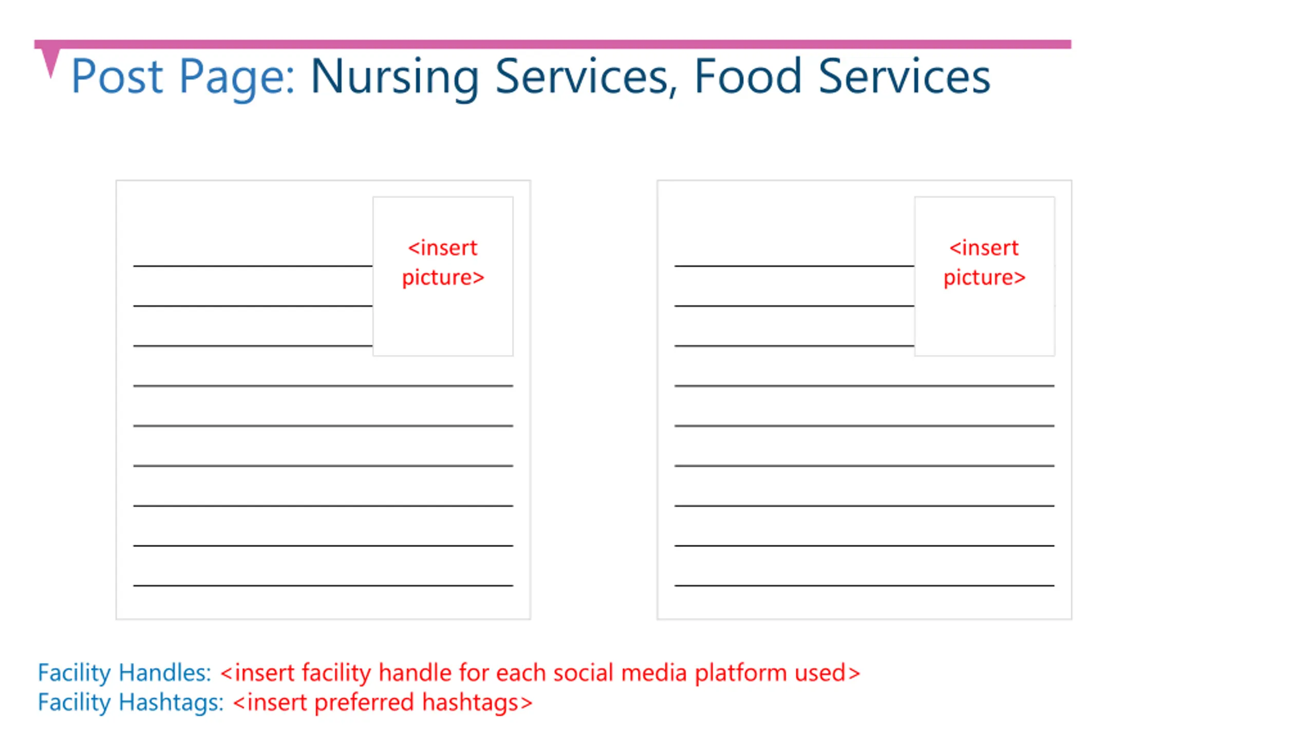Post Page: Nursing Services, Food Services <insert picture> <insert picture> Facility Handles: <insert facility handle for each social media platform used> Facility Hashtags: <insert preferred hashtags>
