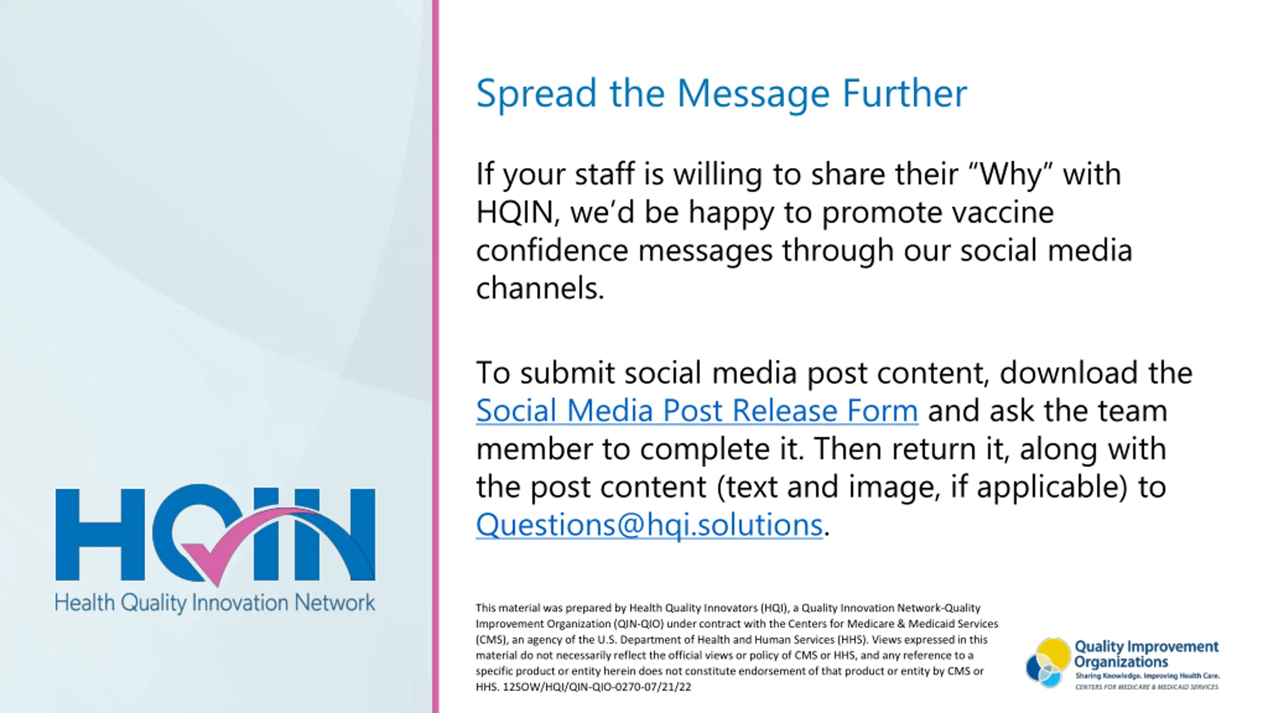 Spread the Message Further If your staff is willing to share their Why with HQIN, we d be happy to promote vaccine confidence messages through our social media channels. To submit social media post content, download the Social Media Post Release Form and ask the team member to complete it. Then return it, along with the post content (text and image, if applicable) to Questions@hqi.solutions. This material was prepared by Health Quality Innovators (HQI), a Quality Innovation Network-Quality Improvement Organization (QIN-QIO) under contract with the Centers for Medicare & Medicaid Services (CMS), an agency of the U.S. Department of Health and Human Services (HHS). Views expressed in this material do not necessarily reflect the official views or policy of CMS or HHS, and any reference to a specific product or entity herein does not constitute endorsement of that product or entity by CMS or HHS. 12SOW/HQI/QIN-QIO-0270-07/21/22