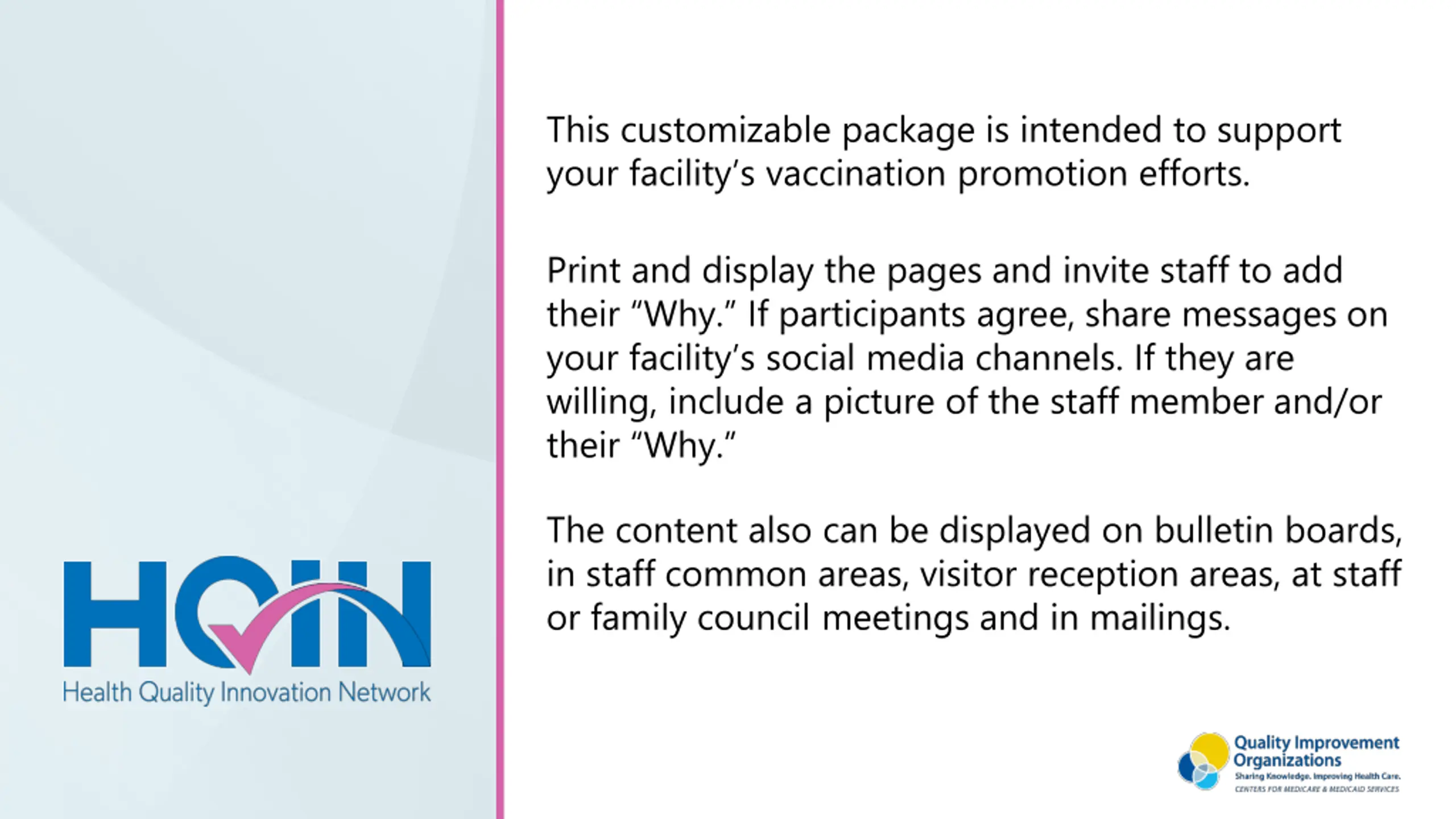 This customizable package is intended to support your facility s vaccination promotion efforts. Print and display the pages and invite staff to add their Why. If participants agree, share messages on your facility s social media channels. If they are willing, include a picture of the staff member and/or their Why. The content also can be displayed on bulletin boards, in staff common areas, visitor reception areas, at staff or family council meetings and in mailings.
