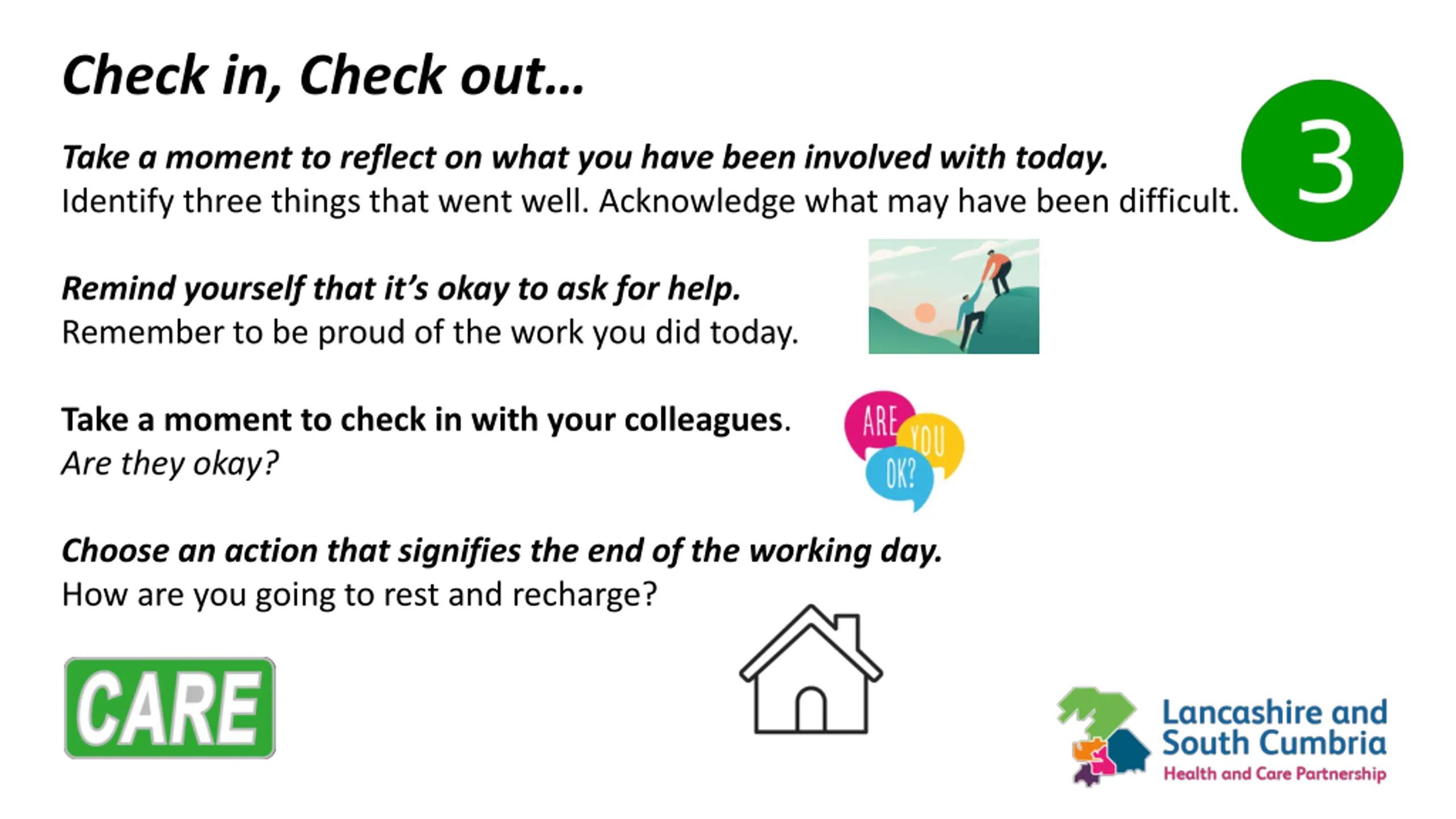 Check in, Check out Take a moment to reflect on what you have been involved with today. Identify three things that went well. Acknowledge what may have been difficult. Remind yourself that it s okay to ask for help. Remember to be proud of the work you did today. Take a moment to check in with your colleagues. Are they okay? Choose an action that signifies the end of the working day. How are you going to rest and recharge?