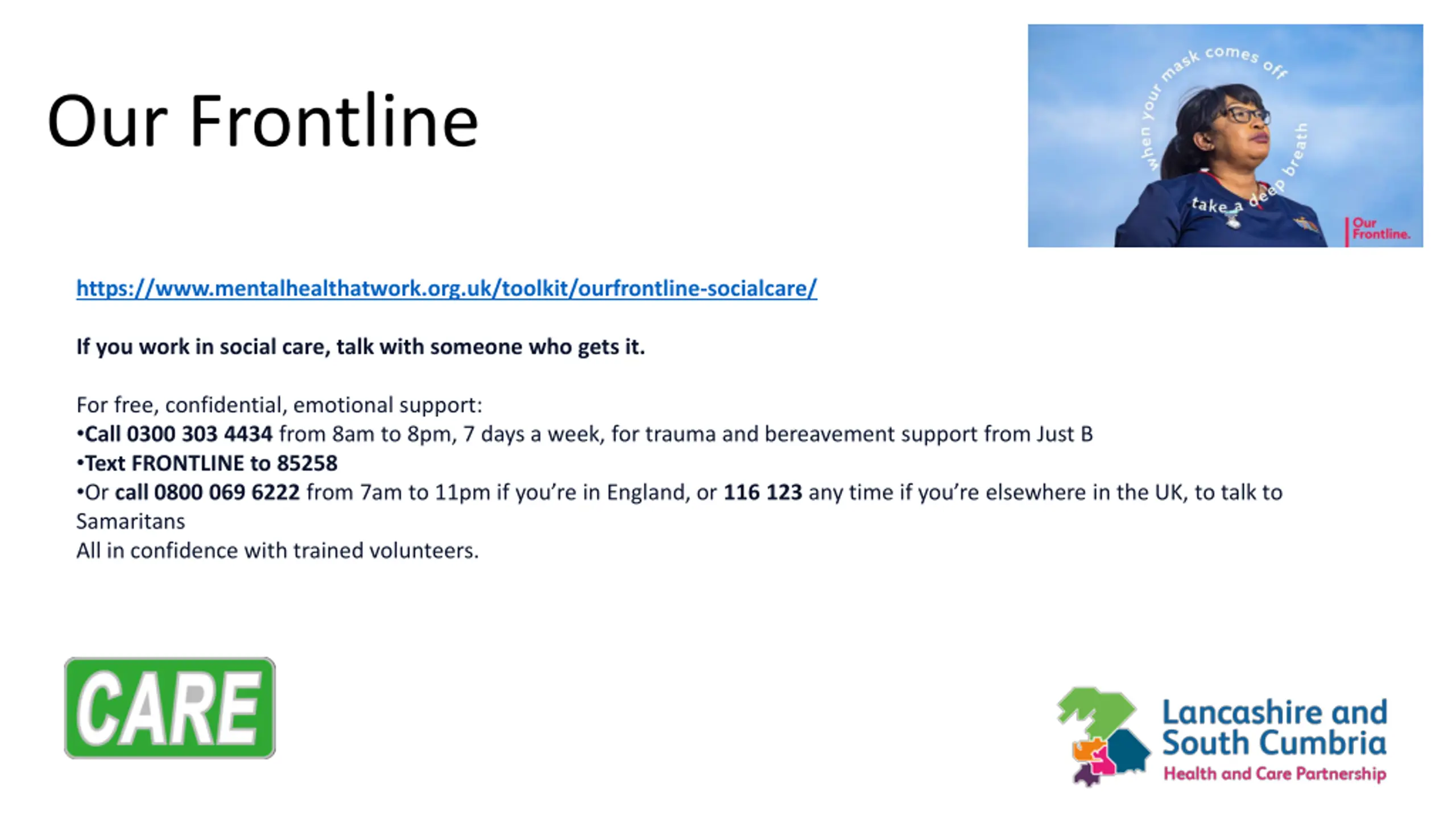 Our Frontline https://www.mentalhealthatwork.org.uk/toolkit/ourfrontline-socialcare/ If you work in social care, talk with someone who gets it. For free, confidential, emotional support: Call 0300 303 4434 from 8am to 8pm, 7 days a week, for trauma and bereavement support from Just B Text FRONTLINE to 85258 Or call 0800 069 6222 from 7am to 11pm if you re in England, or 116 123 any time if you re elsewhere in the UK, to talk to Samaritans All in confidence with trained volunteers.
