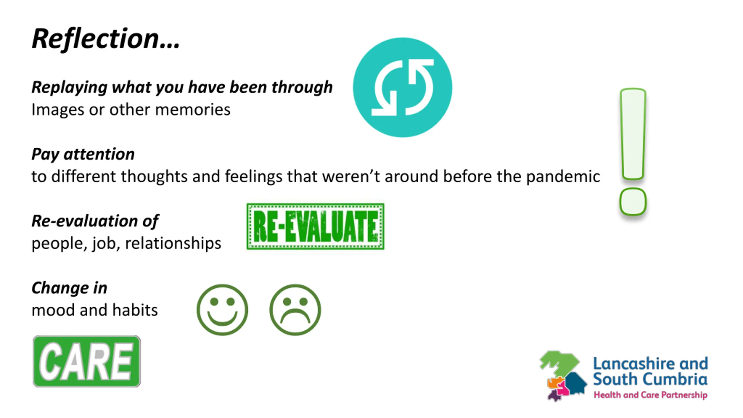 Reflection Replaying what you have been through Images or other memories Pay attention to different thoughts and feelings that weren t around before the pandemic Re-evaluation of people, job, relationships Change in mood and habits