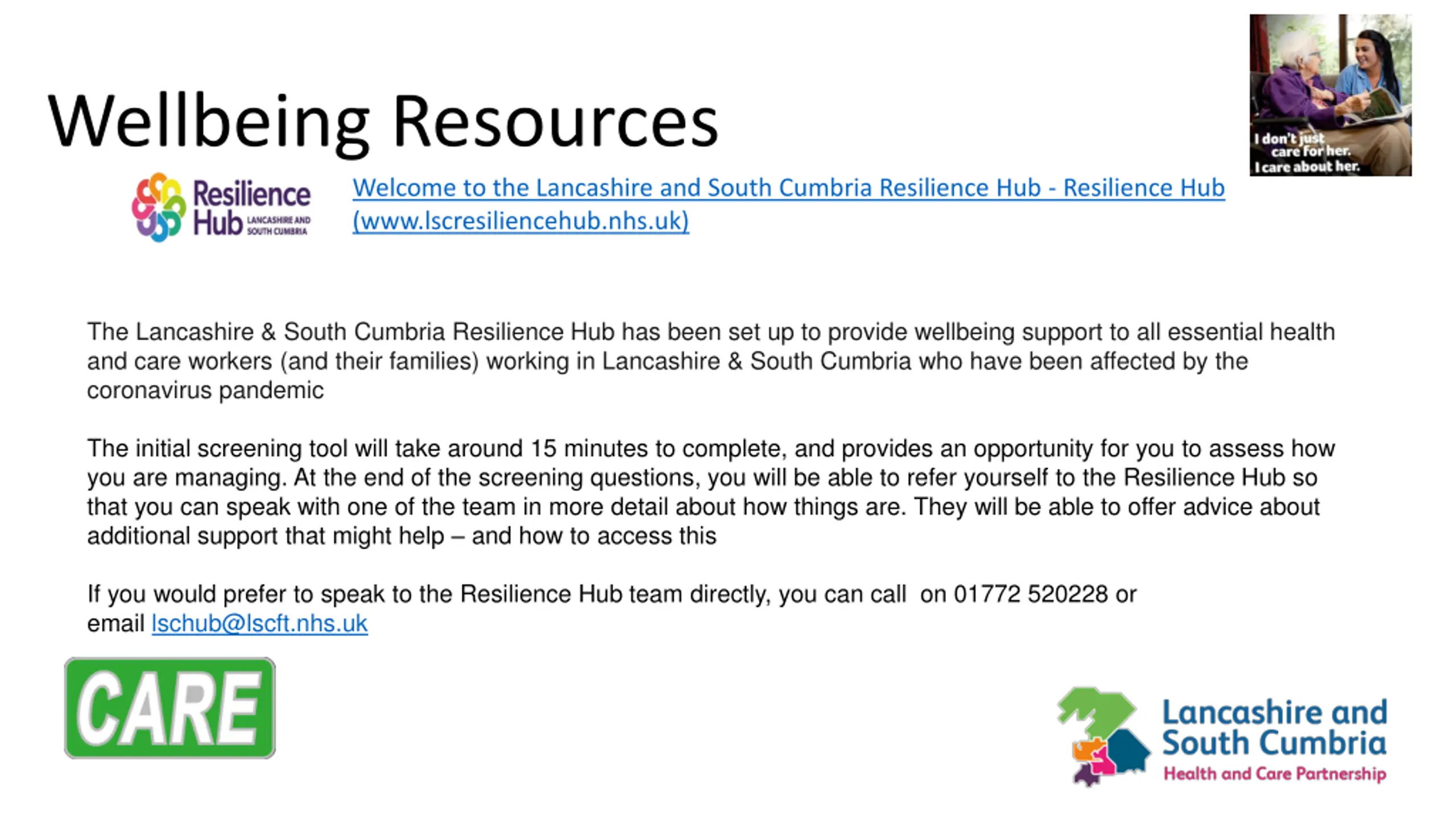 Wellbeing Resources Welcome to the Lancashire and South Cumbria Resilience Hub - Resilience Hub (www.lscresiliencehub.nhs.uk) The Lancashire & South Cumbria Resilience Hub has been set up to provide wellbeing support to all essential health and care workers (and their families) working in Lancashire & South Cumbria who have been affected by the coronavirus pandemic The initial screening tool will take around 15 minutes to complete, and provides an opportunity for you to assess how you are managing. At the end of the screening questions, you will be able to refer yourself to the Resilience Hub so that you can speak with one of the team in more detail about how things are. They will be able to offer advice about additional support that might help and how to access this If you would prefer to speak to the Resilience Hub team directly, you can call on 01772 520228 or email lschub@lscft.nhs.uk