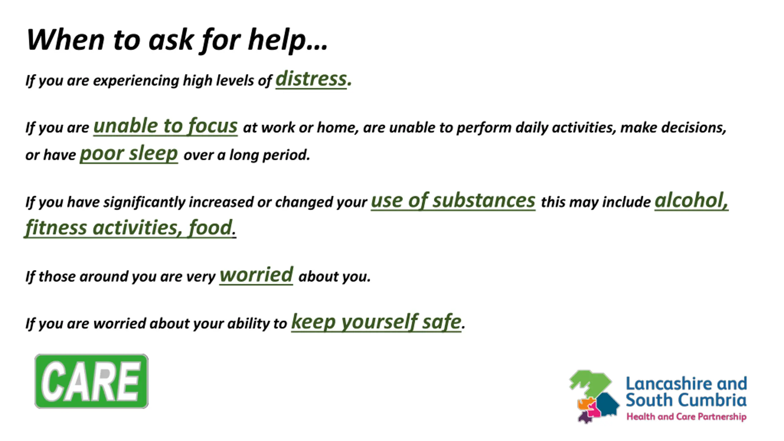 When to ask for help If you are experiencing high levels of distress. If you are unable to focus at work or home, are unable to perform daily activities, make decisions, or have poor sleep over a long period. If you have significantly increased or changed your use of substances this may include alcohol, fitness activities, food. If those around you are very worried about you. If you are worried about your ability to keep yourself safe.