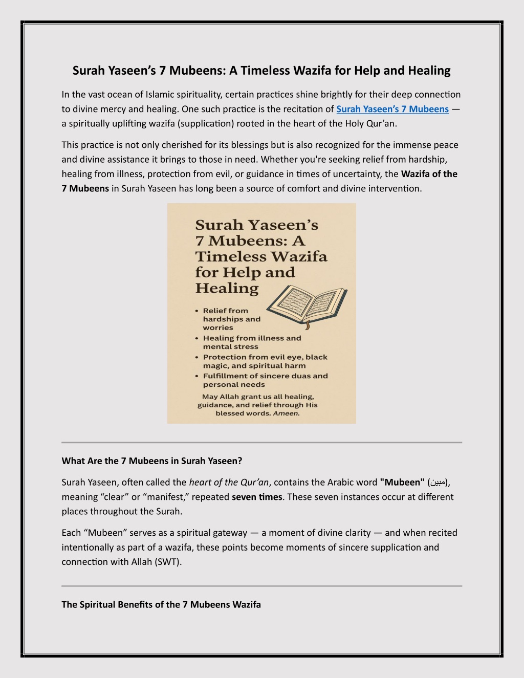 Surah Yaseens 7 Mubeens: A Timeless Wazifa for Help and Healing In the vast ocean of Islamic spirituality, certain practices shine brightly for their deep connection to divine mercy and healing. One such practice is the recitation of Surah Yaseen s 7 Mubeens a spiritually uplifting wazifa (supplication) rooted in the heart of the Holy Qur an. This practice is not only cherished for its blessings but is also recognized for the immense peace and divine assistance it brings to those in need. Whether you're seeking relief from hardship, healing from illness, protection from evil, or guidance in times of uncertainty, the Wazifa of the 7 Mubeens in Surah Yaseen has long been a source of comfort and divine intervention. What Are the 7 Mubeens in Surah Yaseen? Surah Yaseen, often called the heart of the Qur an, contains the Arabic word "Mubeen" ( ), meaning clear or manifest, repeated seven times. These seven instances occur at different places throughout the Surah. Each Mubeen serves as a spiritual gateway a moment of divine clarity and when recited intentionally as part of a wazifa, these points become moments of sincere supplication and connection with Allah (SWT). The Spiritual Benefits of the 7 Mubeens Wazifa