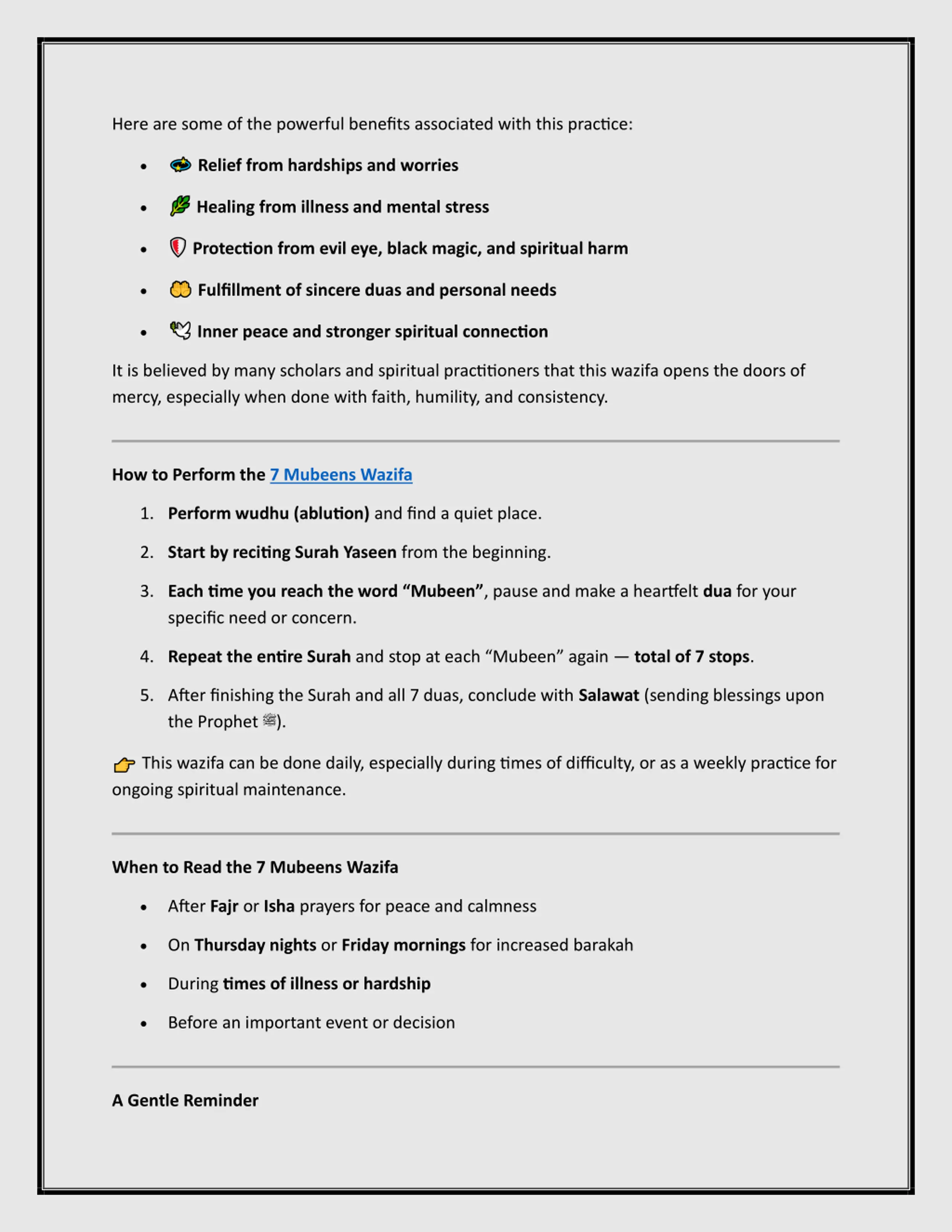 Here are some of the powerful benefits associated with this practice: Relief from hardships and worries Healing from illness and mental stress Protection from evil eye, black magic, and spiritual harm Fulfillment of sincere duas and personal needs Inner peace and stronger spiritual connection It is believed by many scholars and spiritual practitioners that this wazifa opens the doors of mercy, especially when done with faith, humility, and consistency. How to Perform the 7 Mubeens Wazifa 1.Perform wudhu (ablution) and find a quiet place. 2.Start by reciting Surah Yaseen from the beginning. 3.Each time you reach the word Mubeen , pause and make a heartfelt dua for your specific need or concern. 4.Repeat the entire Surah and stop at each Mubeen again total of 7 stops. 5.After finishing the Surah and all 7 duas, conclude with Salawat (sending blessings upon the Prophet ). This wazifa can be done daily, especially during times of difficulty, or as a weekly practice for ongoing spiritual maintenance. When to Read the 7 Mubeens Wazifa After Fajr or Isha prayers for peace and calmness On Thursday nights or Friday mornings for increased barakah During times of illness or hardship Before an important event or decision A Gentle Reminder