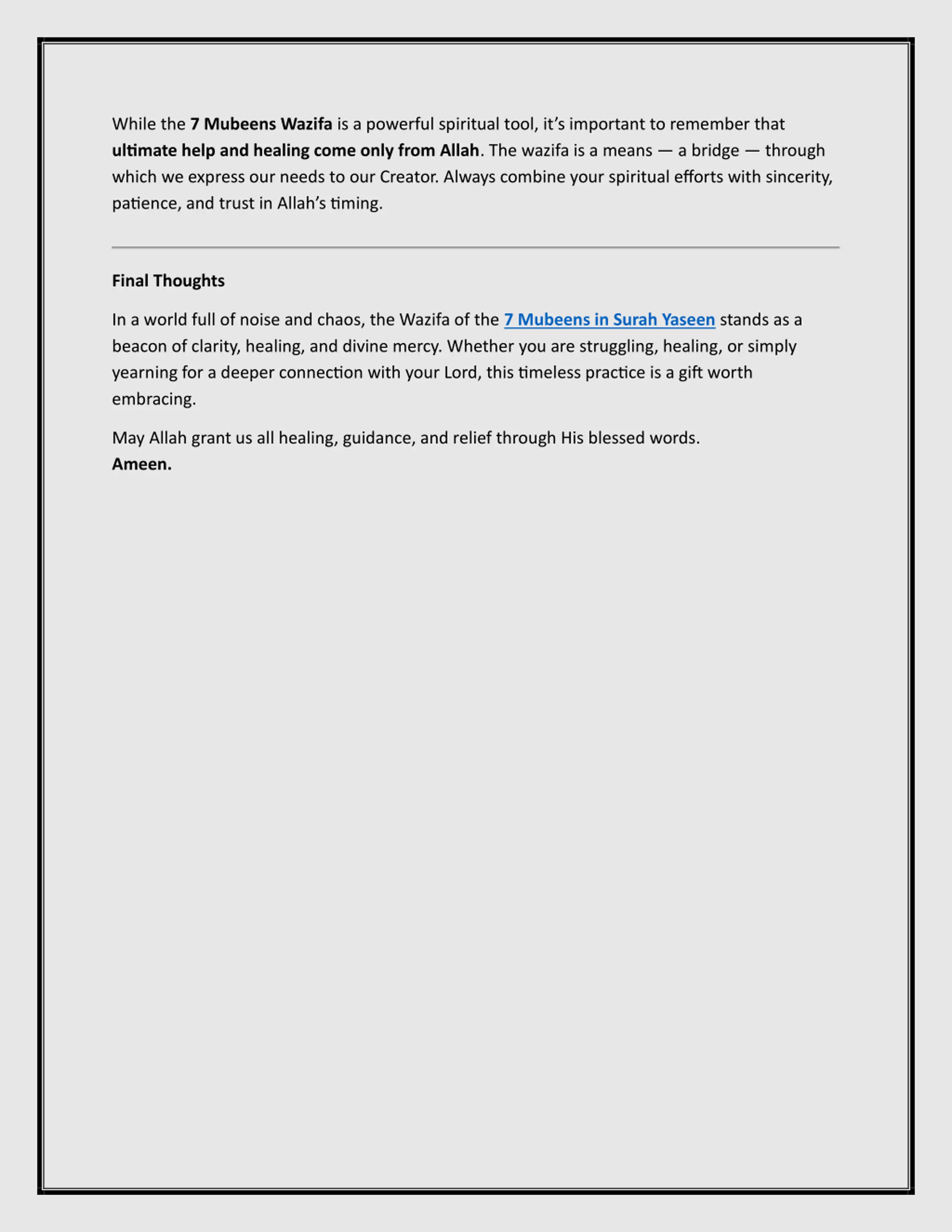 While the 7 Mubeens Wazifa is a powerful spiritual tool, its important to remember that ultimate help and healing come only from Allah. The wazifa is a means a bridge through which we express our needs to our Creator. Always combine your spiritual efforts with sincerity, patience, and trust in Allah s timing. Final Thoughts In a world full of noise and chaos, the Wazifa of the 7 Mubeens in Surah Yaseen stands as a beacon of clarity, healing, and divine mercy. Whether you are struggling, healing, or simply yearning for a deeper connection with your Lord, this timeless practice is a gift worth embracing. May Allah grant us all healing, guidance, and relief through His blessed words. Ameen.