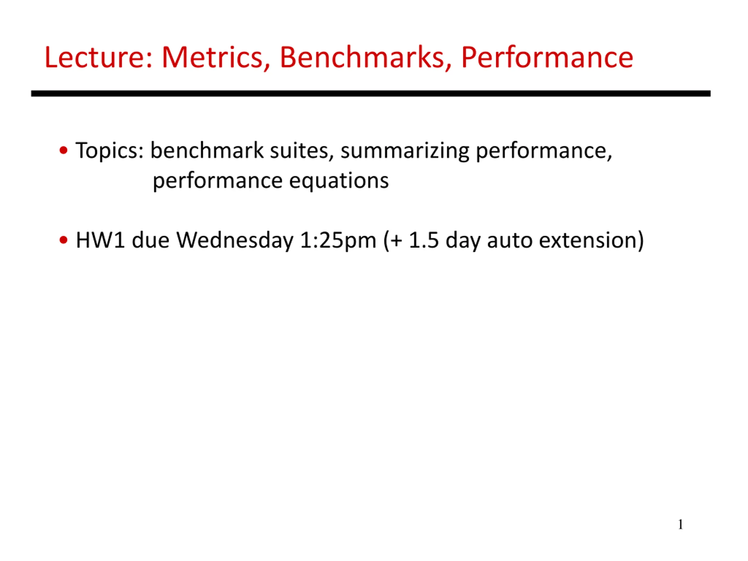 Lecture: Metrics, Benchmarks, Performance Topics: benchmark suites, summarizing performance, performance equations HW1 due Wednesday 1:25pm (+ 1.5 day auto extension) 1