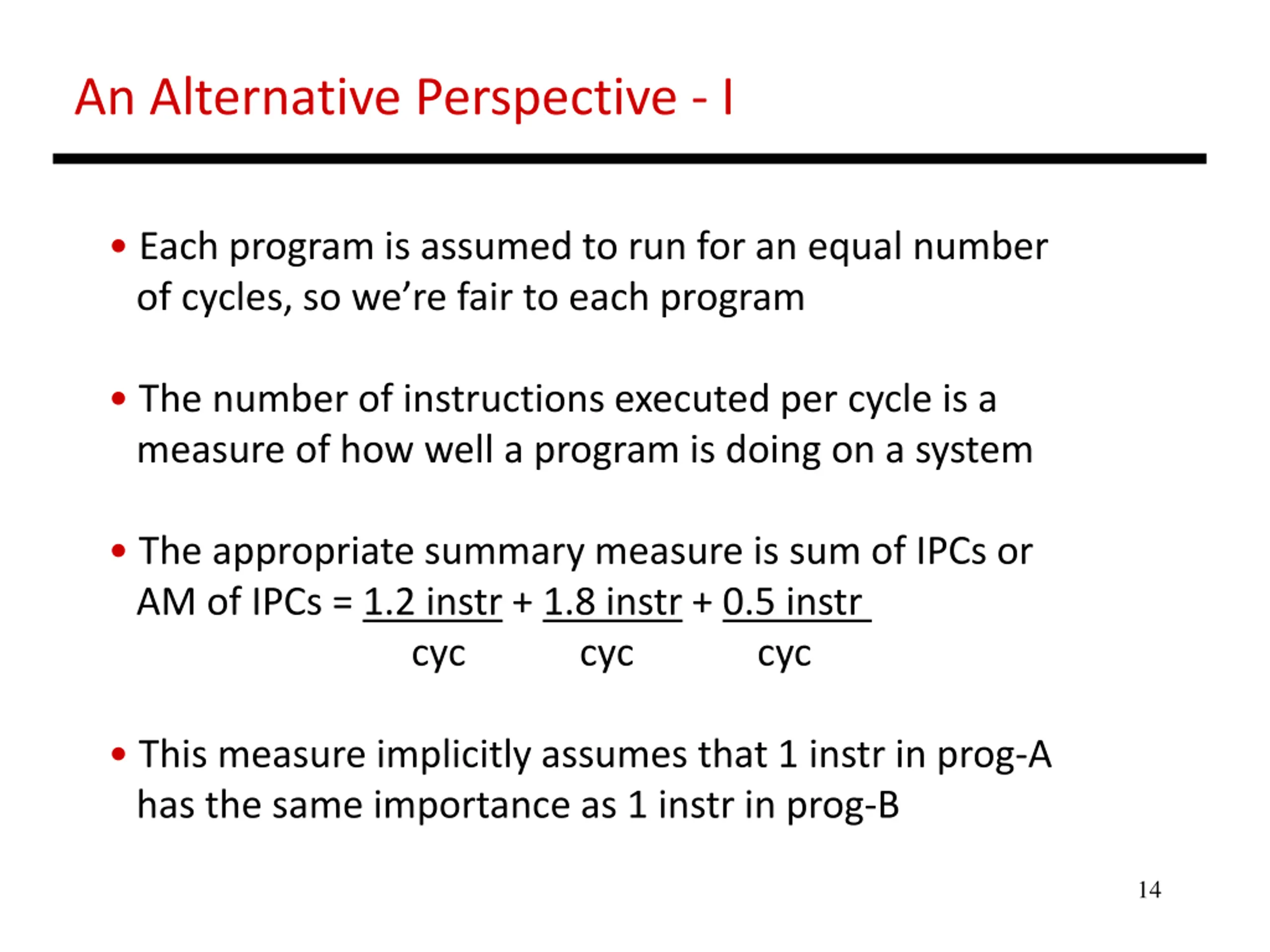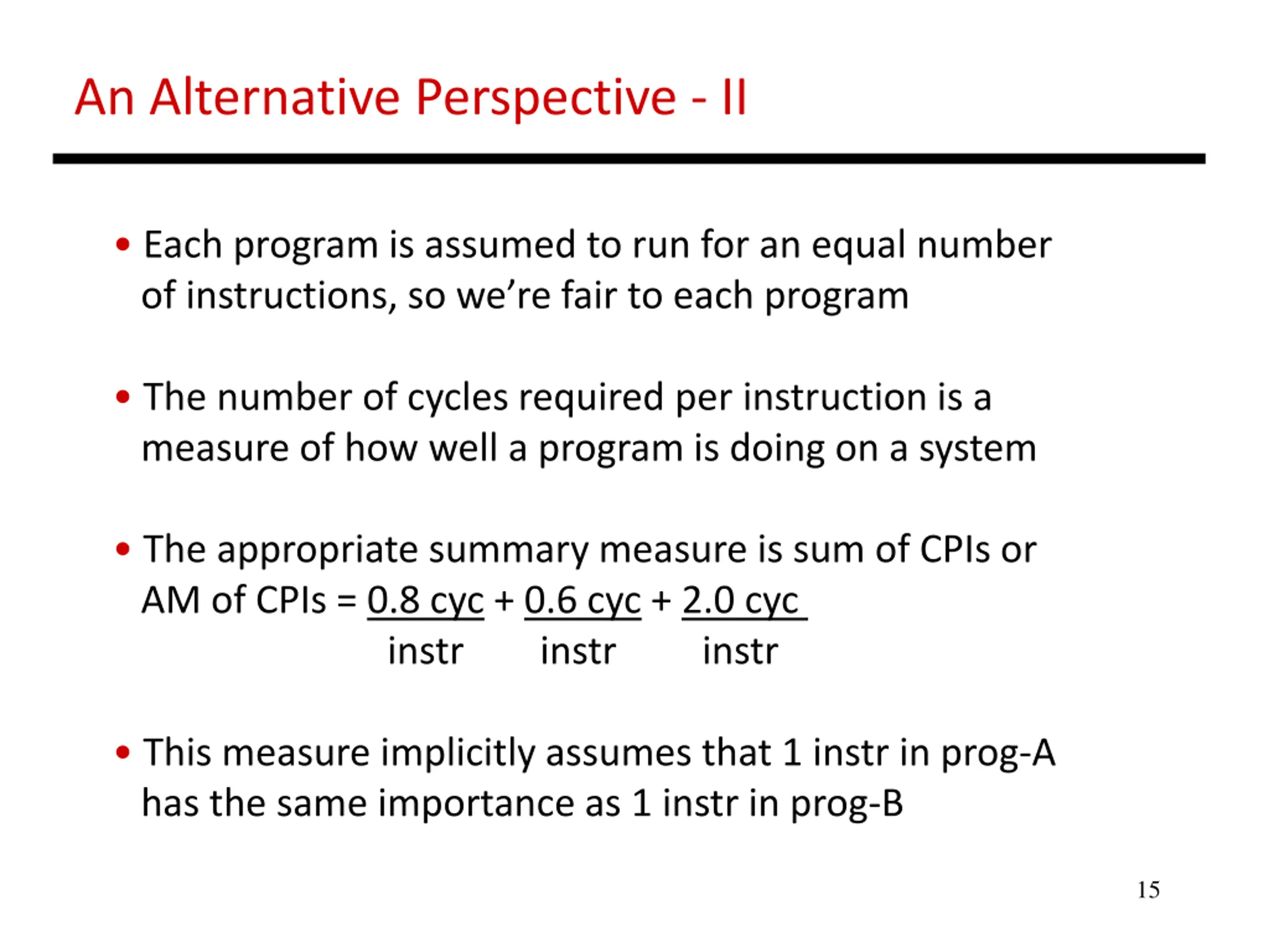 An Alternative Perspective - I Each program is assumed to run for an equal number of cycles, so we re fair to each program The number of instructions executed per cycle is a measure of how well a program is doing on a system The appropriate summary measure is sum of IPCs or AM of IPCs = 1.2 instr + 1.8 instr + 0.5 instr cyc cyc cyc This measure implicitly assumes that 1 instr in prog-A has the same importance as 1 instr in prog-B 14