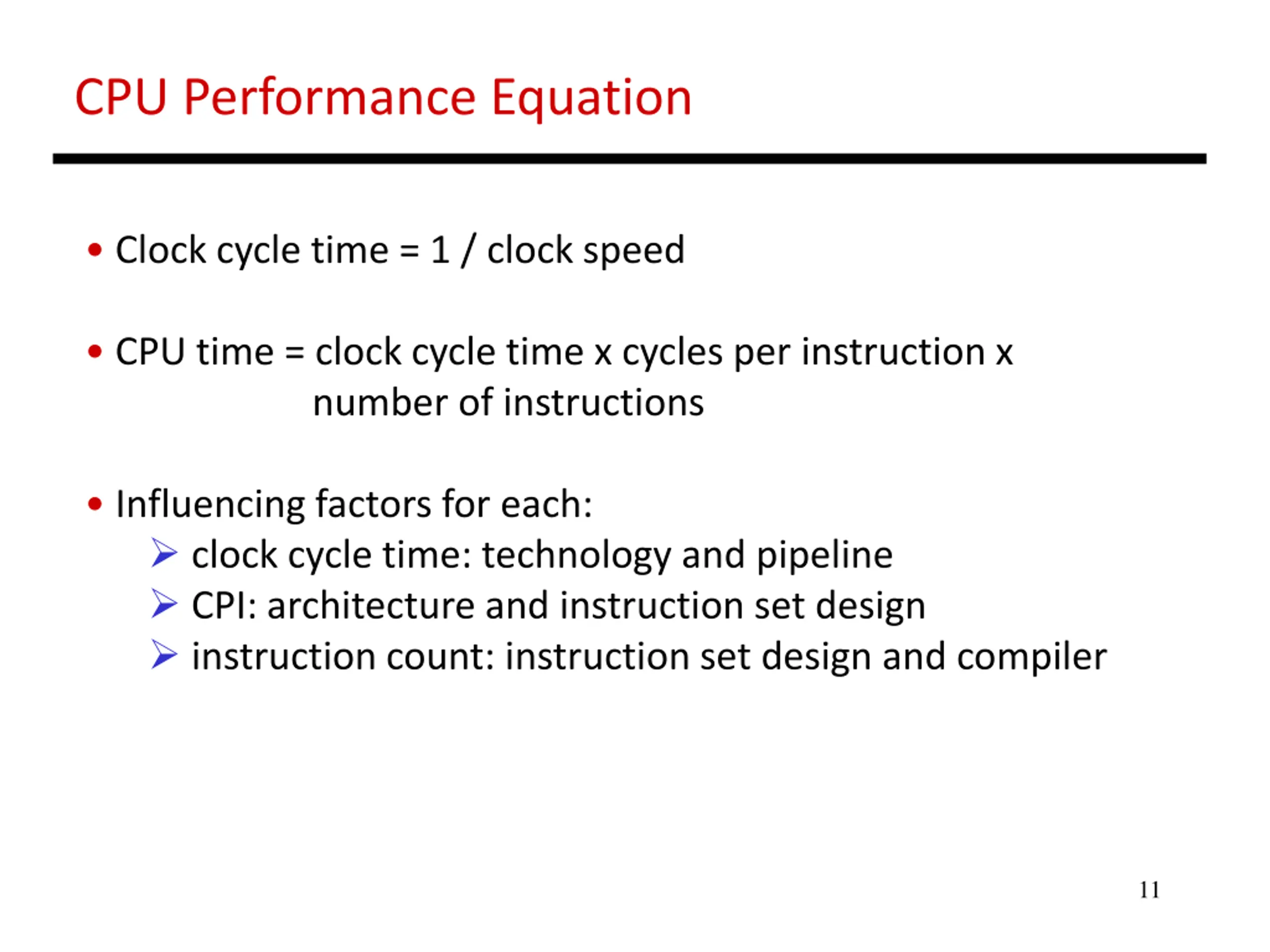 CPU Performance Equation Clock cycle time = 1 / clock speed CPU time = clock cycle time x cycles per instruction x number of instructions Influencing factors for each: clock cycle time: technology and pipeline CPI: architecture and instruction set design instruction count: instruction set design and compiler 11