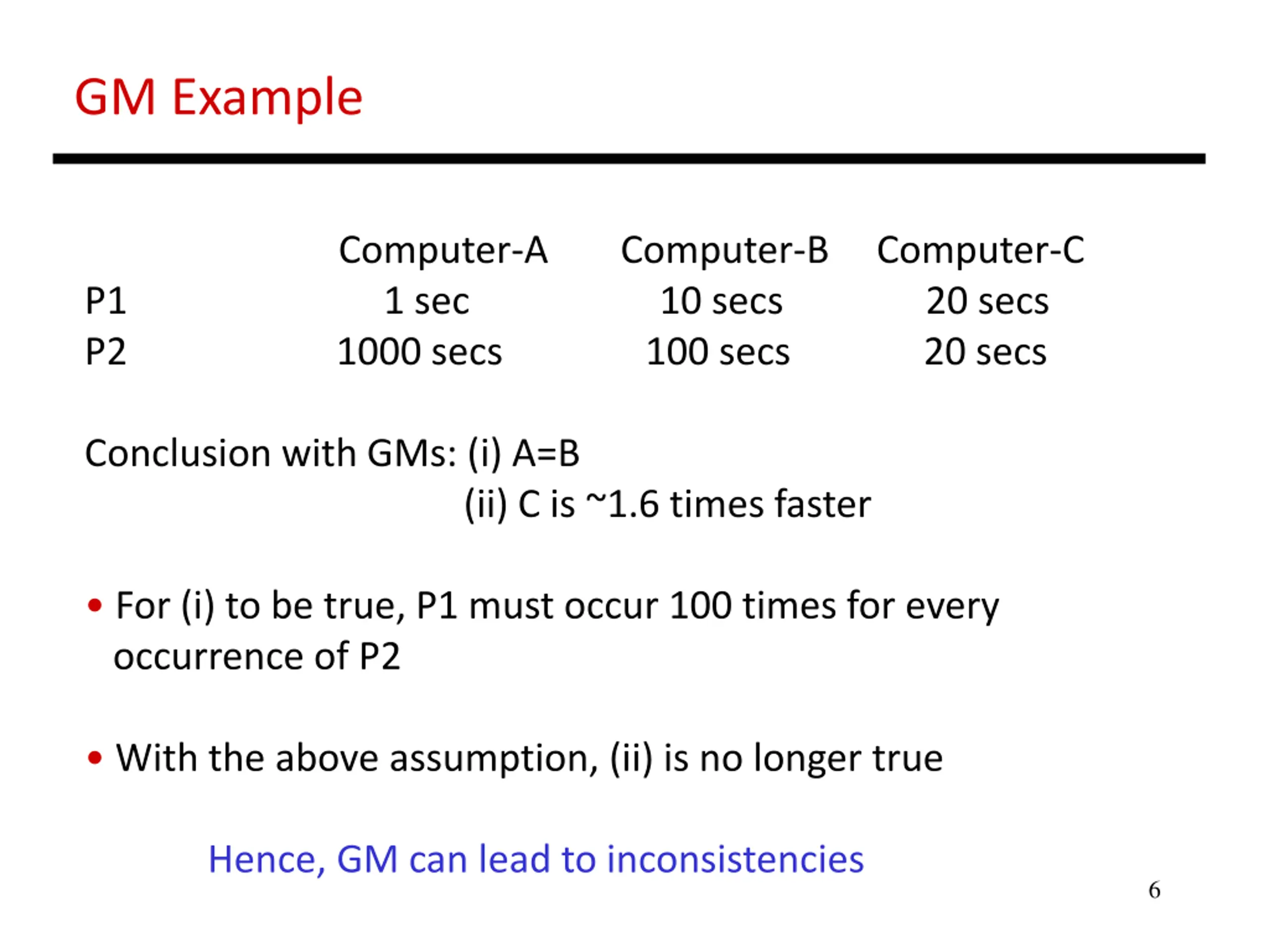 GM Example Computer-A Computer-B Computer-C P1 1 sec 10 secs 20 secs P2 1000 secs 100 secs 20 secs Conclusion with GMs: (i) A=B (ii) C is ~1.6 times faster For (i) to be true, P1 must occur 100 times for every occurrence of P2 With the above assumption, (ii) is no longer true Hence, GM can lead to inconsistencies 6
