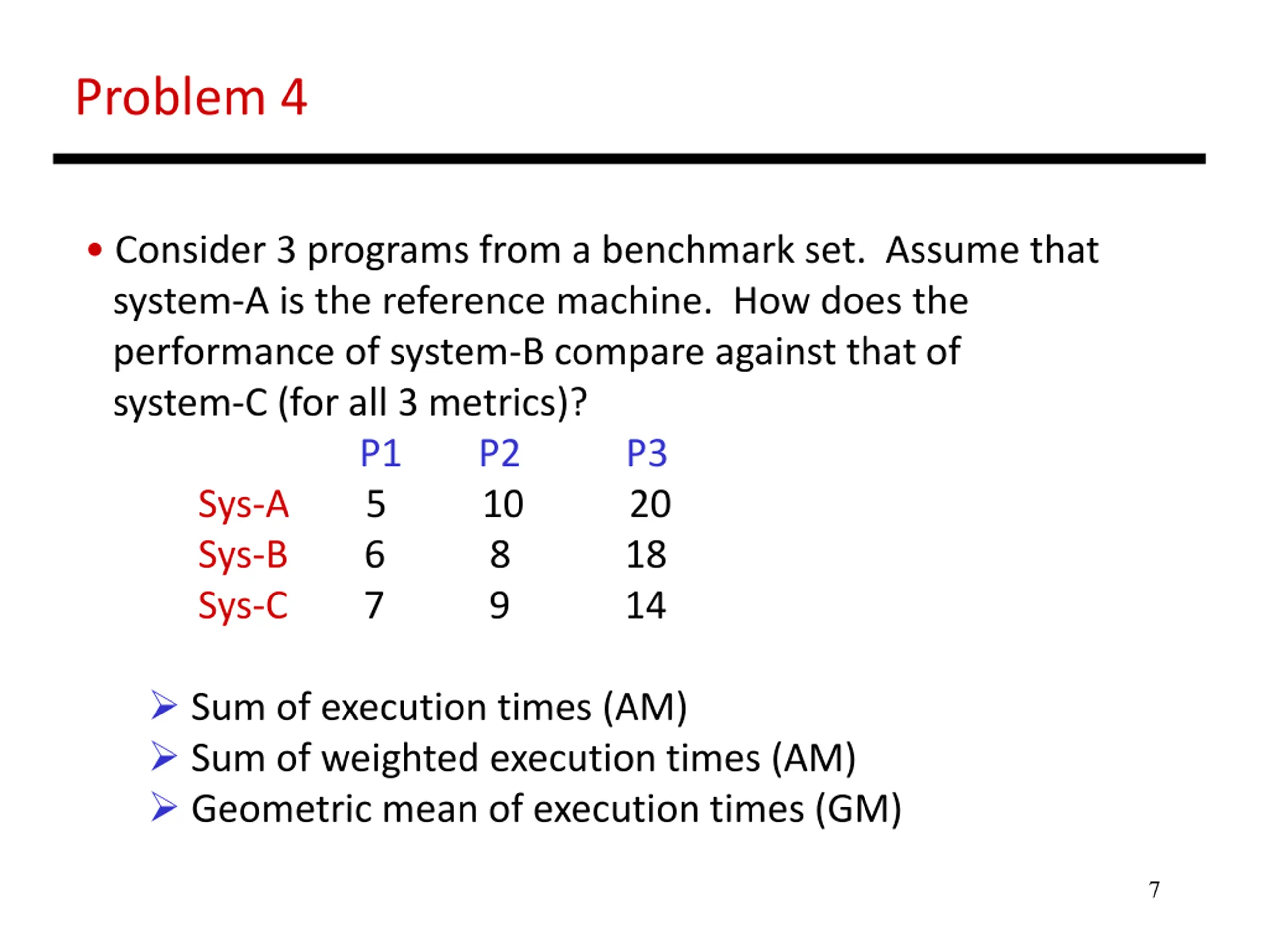 Problem 4 Consider 3 programs from a benchmark set. Assume that system-A is the reference machine. How does the performance of system-B compare against that of system-C (for all 3 metrics)? P1 P2 P3 Sys-A 5 10 20 Sys-B 6 8 18 Sys-C 7 9 14 Sum of execution times (AM) Sum of weighted execution times (AM) Geometric mean of execution times (GM) 7