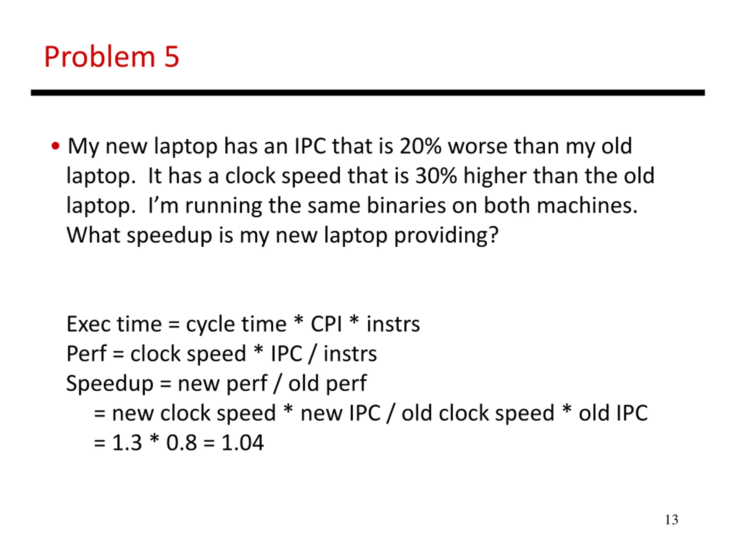 Problem 5 My new laptop has an IPC that is 20% worse than my old laptop. It has a clock speed that is 30% higher than the old laptop. I m running the same binaries on both machines. What speedup is my new laptop providing? 12