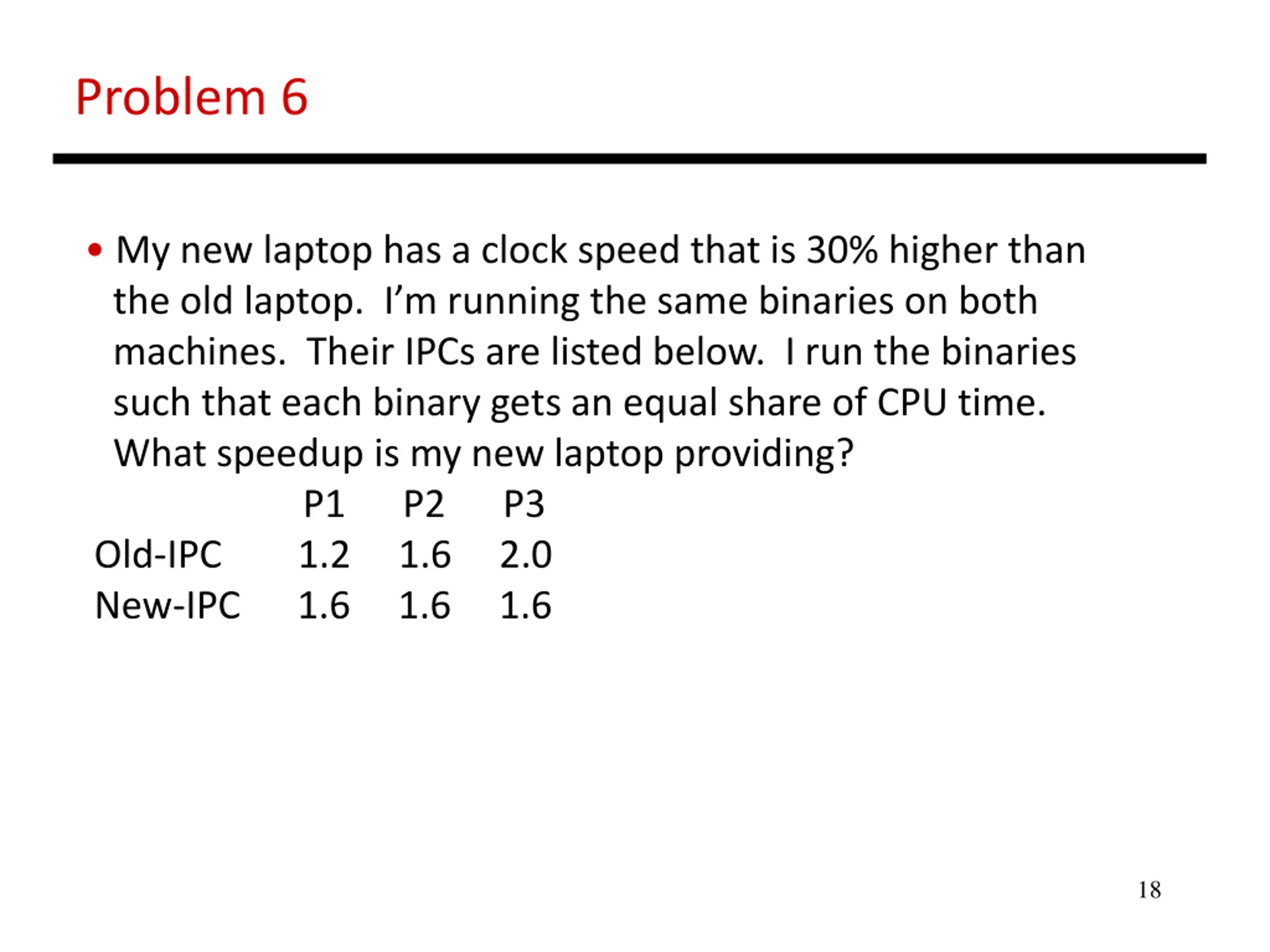 Problem 6 My new laptop has a clock speed that is 30% higher than the old laptop. I m running the same binaries on both machines. Their IPCs are listed below. I run the binaries such that each binary gets an equal share of CPU time. What speedup is my new laptop providing? P1 P2 P3 Old-IPC 1.2 1.6 2.0 New-IPC 1.6 1.6 1.6 18