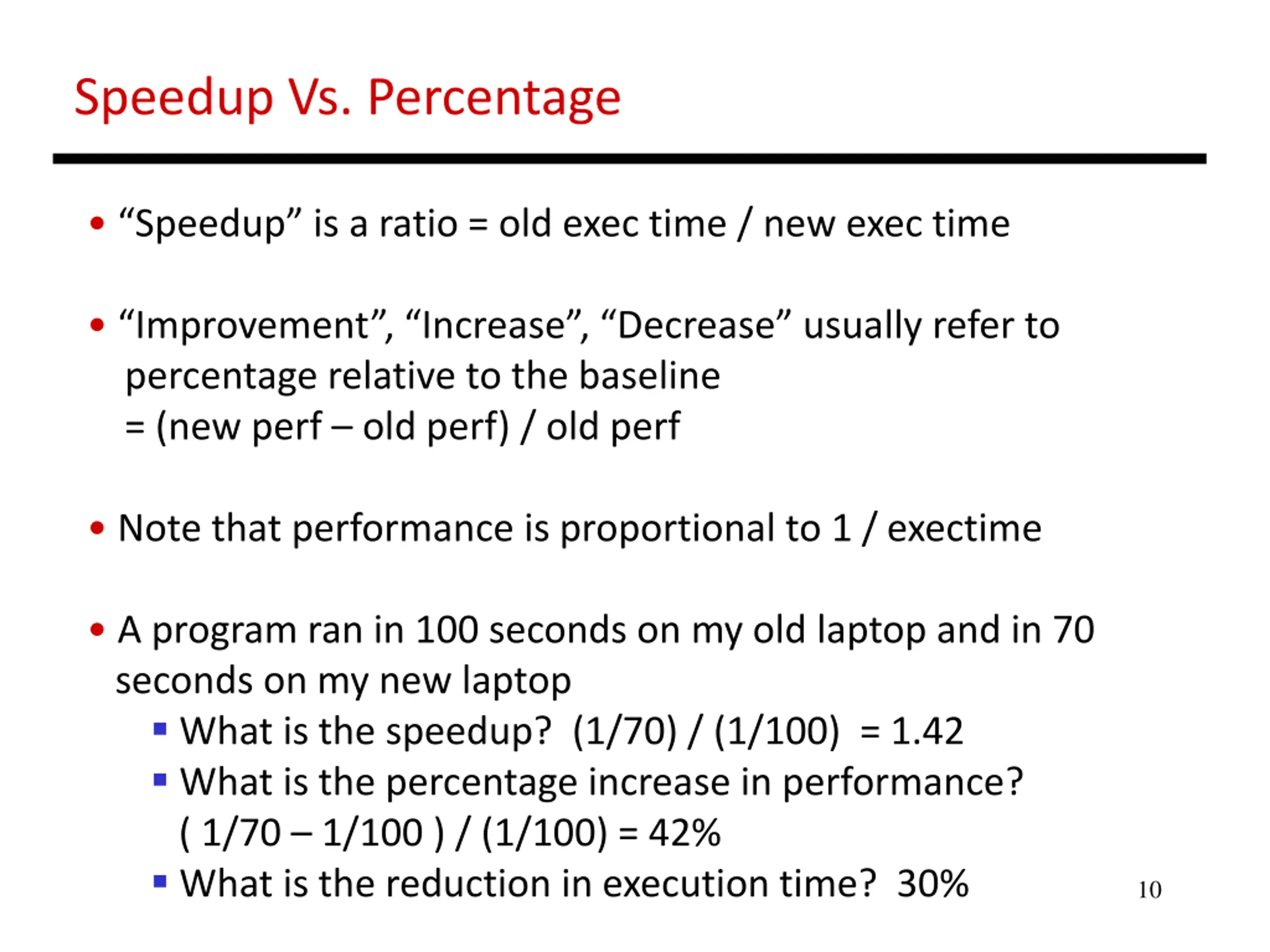 Speedup Vs. Percentage Speedup is a ratio = old exec time / new exec time Improvement , Increase , Decrease usually refer to percentage relative to the baseline = (new perf old perf) / old perf Note that performance is proportional to 1 / exectime A program ran in 100 seconds on my old laptop and in 70 seconds on my new laptop What is the speedup? (1/70) / (1/100) = 1.42 What is the percentage increase in performance? ( 1/70 1/100 ) / (1/100) = 42% What is the reduction in execution time? 30% 10