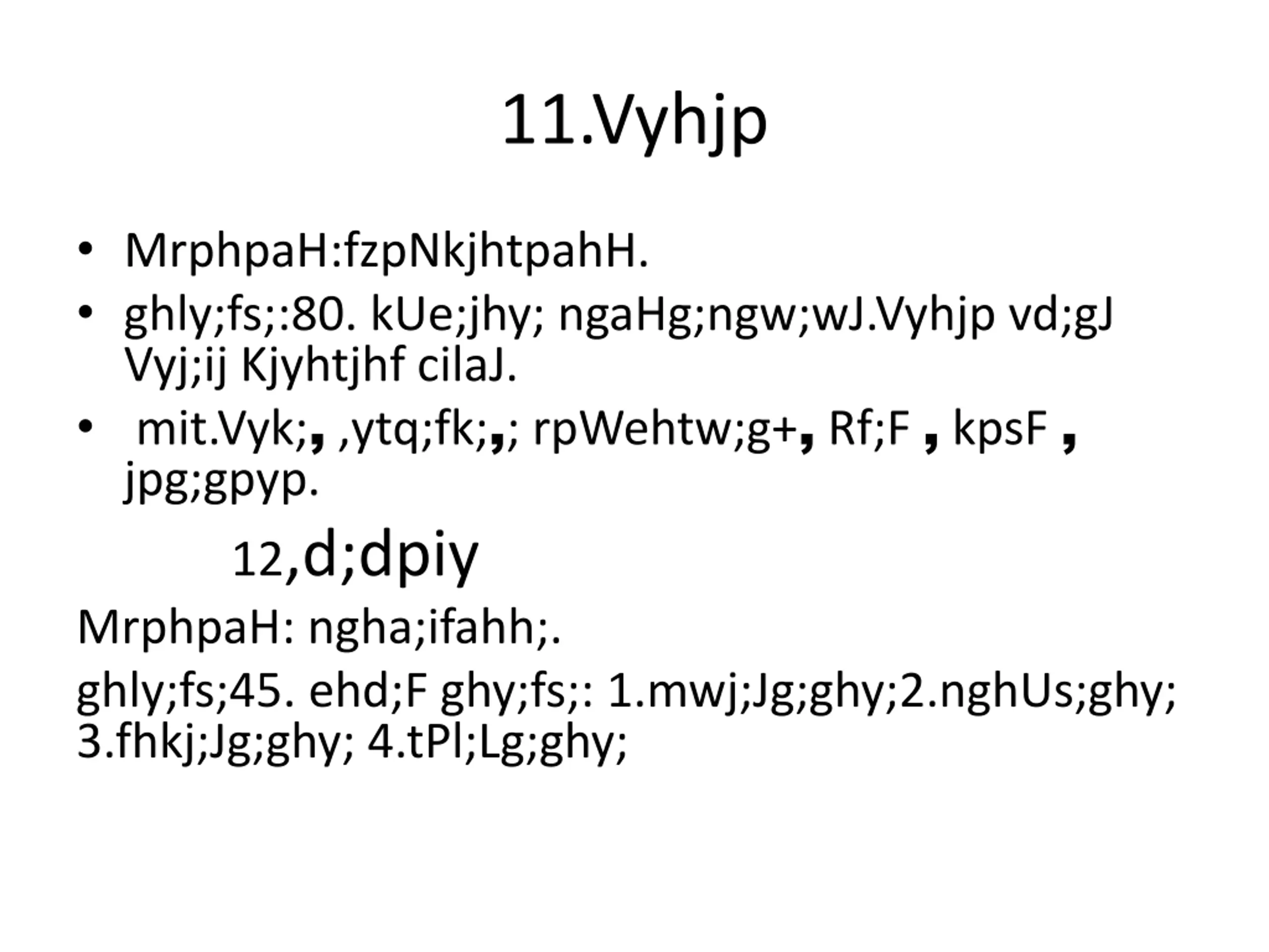 11.Vyhjp MrphpaH:fzpNkjhtpahH. ghly;fs;:80. kUe;jhy; ngaHg;ngw;wJ.Vyhjp vd;gJ Vyj;ij Kjyhtjhf cilaJ. mit.Vyk;, ,ytq;fk;,; rpWehtw;g+, Rf;F , kpsF , jpg;gpyp. 12,d;dpiy MrphpaH: ngha;ifahh;. ghly;fs;45. ehd;F ghy;fs;: 1.mwj;Jg;ghy;2.nghUs;ghy; 3.fhkj;Jg;ghy; 4.tPl;Lg;ghy;