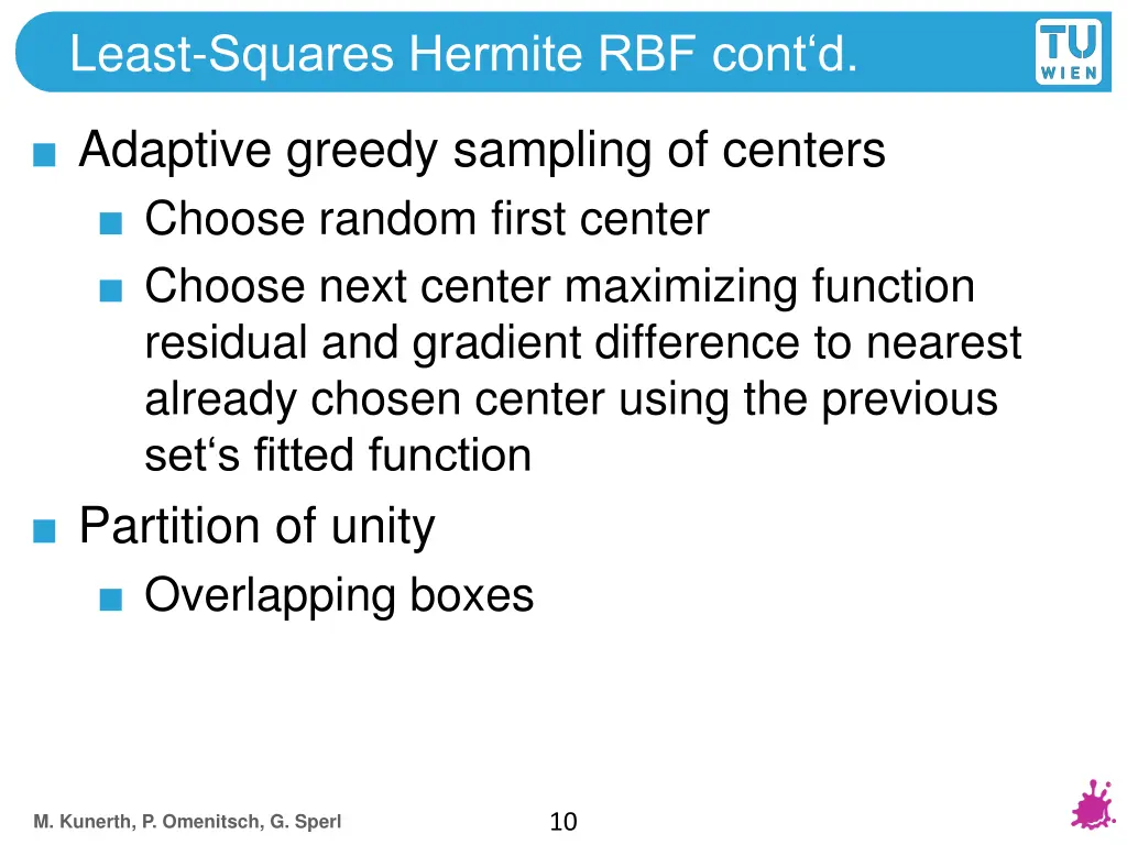 Least-Squares Hermite RBF contd. Adaptive greedy sampling of centers Choose random first center Choose next center maximizing function residual and gradient difference to nearest already chosen center using the previous set s fitted function Partition of unity Overlapping boxes 10 M. Kunerth, P. Omenitsch, G. Sperl