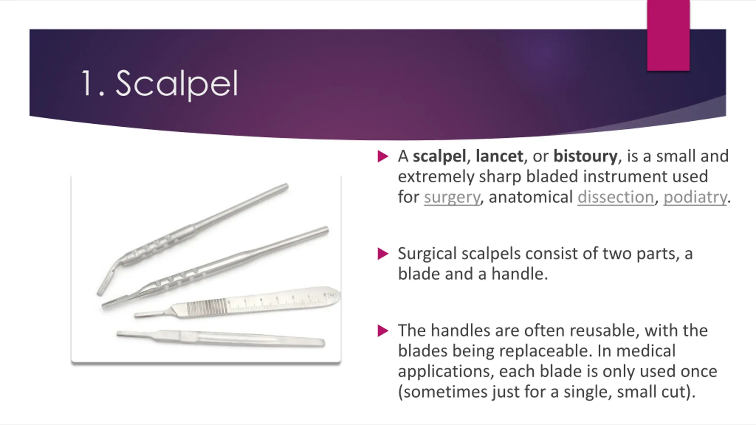 1. Scalpel A scalpel, lancet, or bistoury, is a small and extremely sharp bladed instrument used for surgery, anatomical dissection, podiatry. Surgical scalpels consist of two parts, a blade and a handle. The handles are often reusable, with the blades being replaceable. In medical applications, each blade is only used once (sometimes just for a single, small cut).