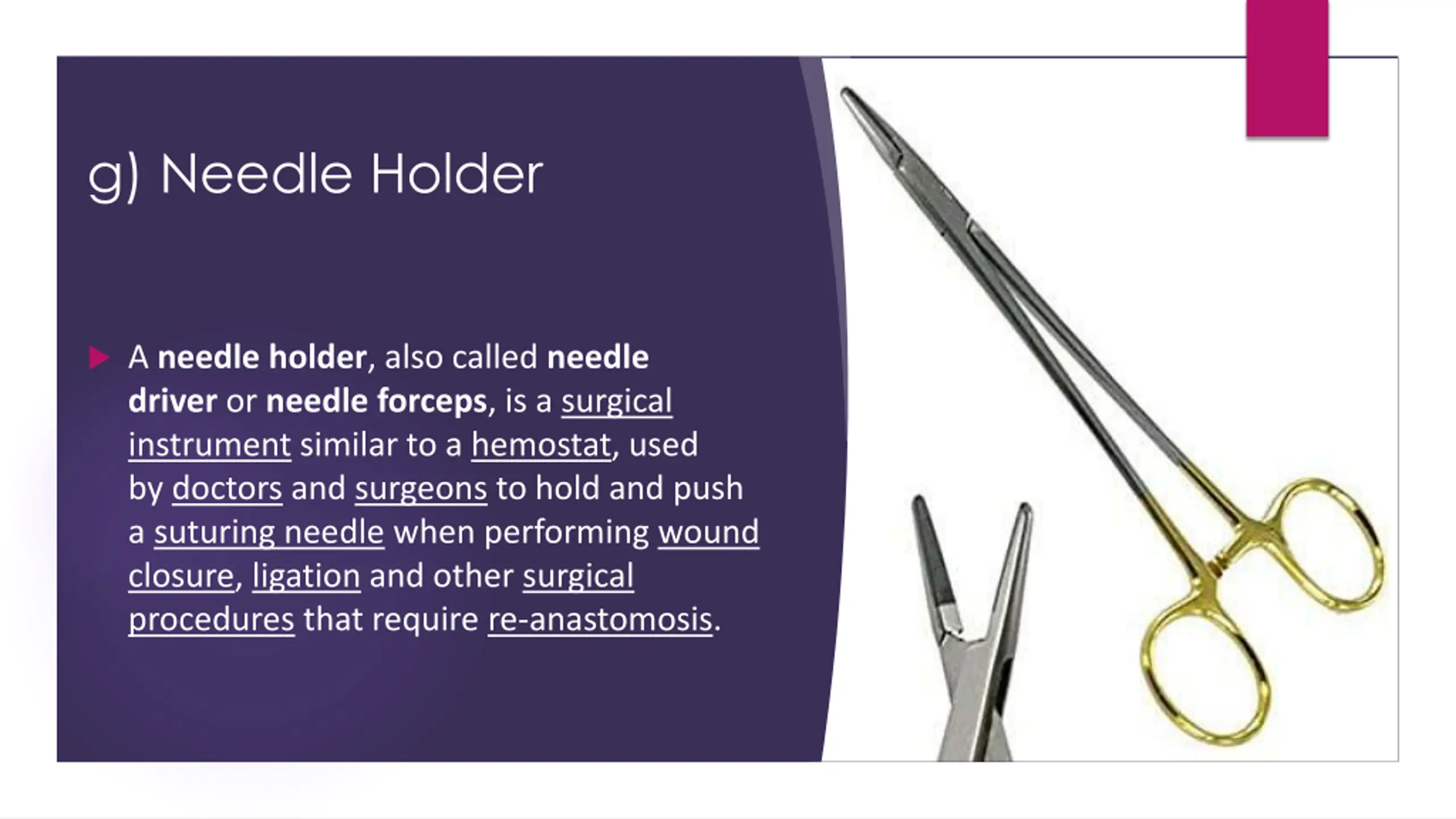 g) Needle Holder A needle holder, also called needle driver or needle forceps, is a surgical instrument similar to a hemostat, used by doctors and surgeons to hold and push a suturing needle when performing wound closure, ligation and other surgical procedures that require re-anastomosis.
