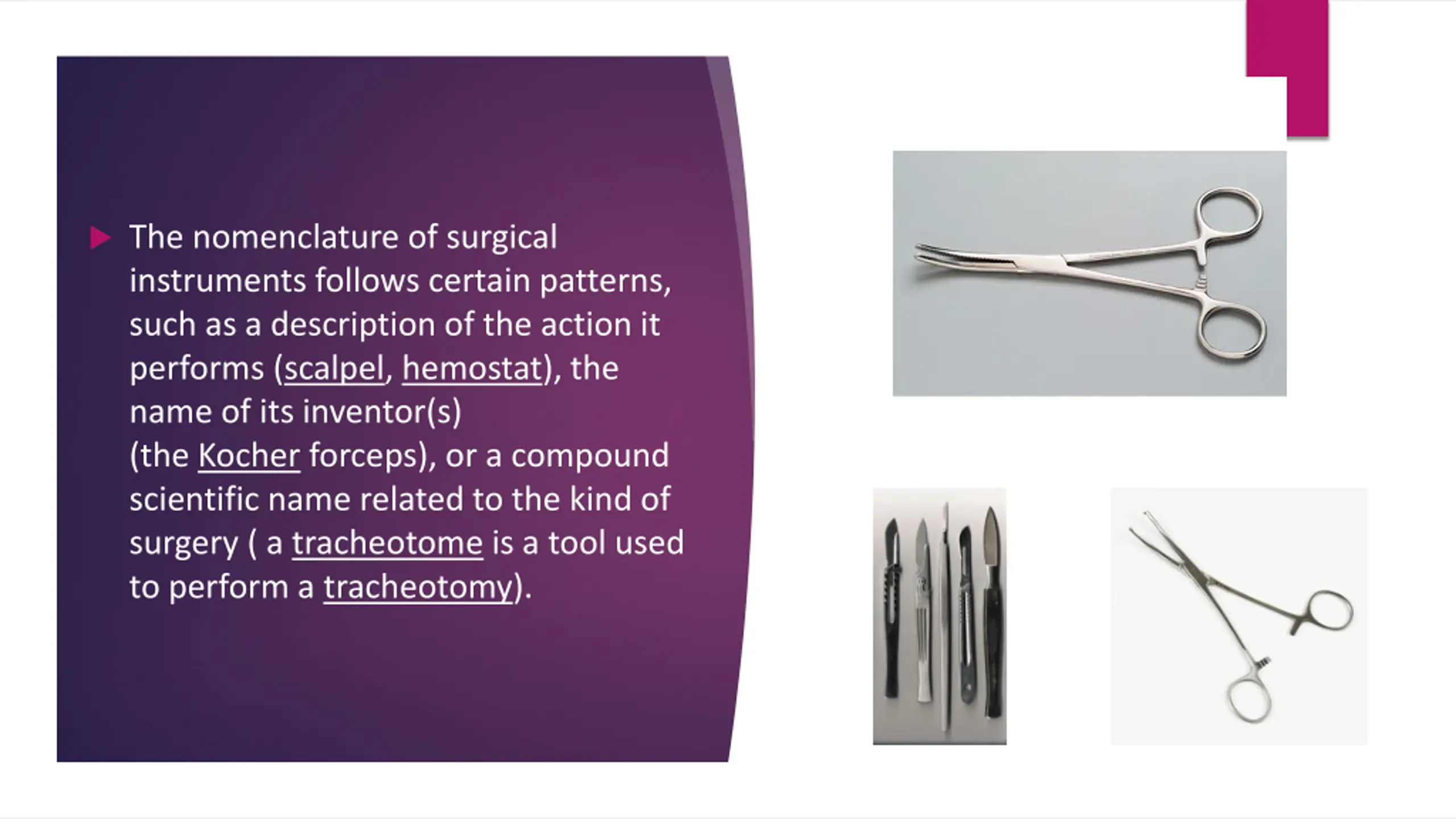 The nomenclature of surgical instruments follows certain patterns, such as a description of the action it performs (scalpel, hemostat), the name of its inventor(s) (the Kocher forceps), or a compound scientific name related to the kind of surgery ( a tracheotome is a tool used to perform a tracheotomy).