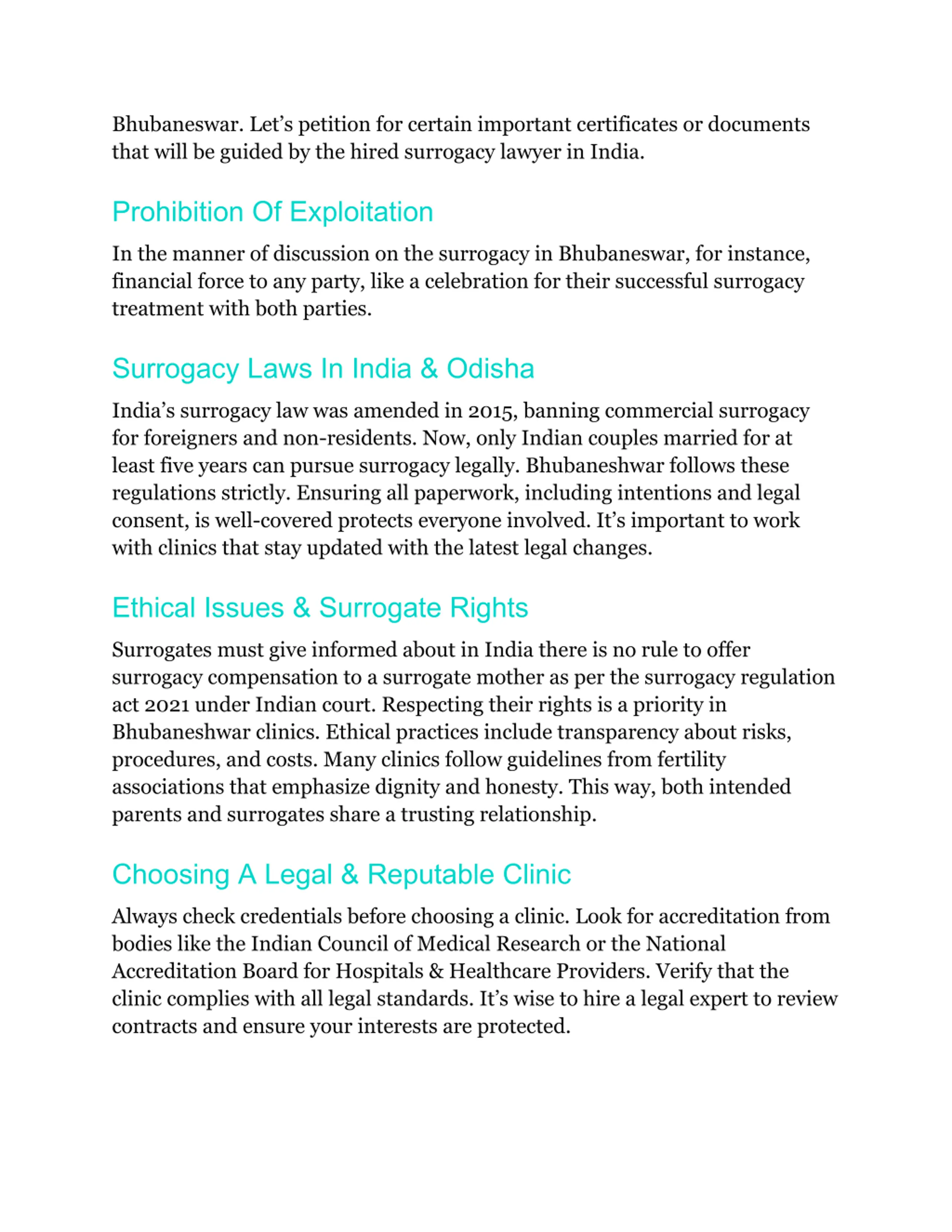 Bhubaneswar. Lets petition for certain important certificates or documents that will be guided by the hired surrogacy lawyer in India. Prohibition Of Exploitation In the manner of discussion on the surrogacy in Bhubaneswar, for instance, financial force to any party, like a celebration for their successful surrogacy treatment with both parties. Surrogacy Laws In India & Odisha India s surrogacy law was amended in 2015, banning commercial surrogacy for foreigners and non-residents. Now, only Indian couples married for at least five years can pursue surrogacy legally. Bhubaneshwar follows these regulations strictly. Ensuring all paperwork, including intentions and legal consent, is well-covered protects everyone involved. It s important to work with clinics that stay updated with the latest legal changes. Ethical Issues & Surrogate Rights Surrogates must give informed about in India there is no rule to offer surrogacy compensation to a surrogate mother as per the surrogacy regulation act 2021 under Indian court. Respecting their rights is a priority in Bhubaneshwar clinics. Ethical practices include transparency about risks, procedures, and costs. Many clinics follow guidelines from fertility associations that emphasize dignity and honesty. This way, both intended parents and surrogates share a trusting relationship. Choosing A Legal & Reputable Clinic Always check credentials before choosing a clinic. Look for accreditation from bodies like the Indian Council of Medical Research or the National Accreditation Board for Hospitals & Healthcare Providers. Verify that the clinic complies with all legal standards. It s wise to hire a legal expert to review contracts and ensure your interests are protected.