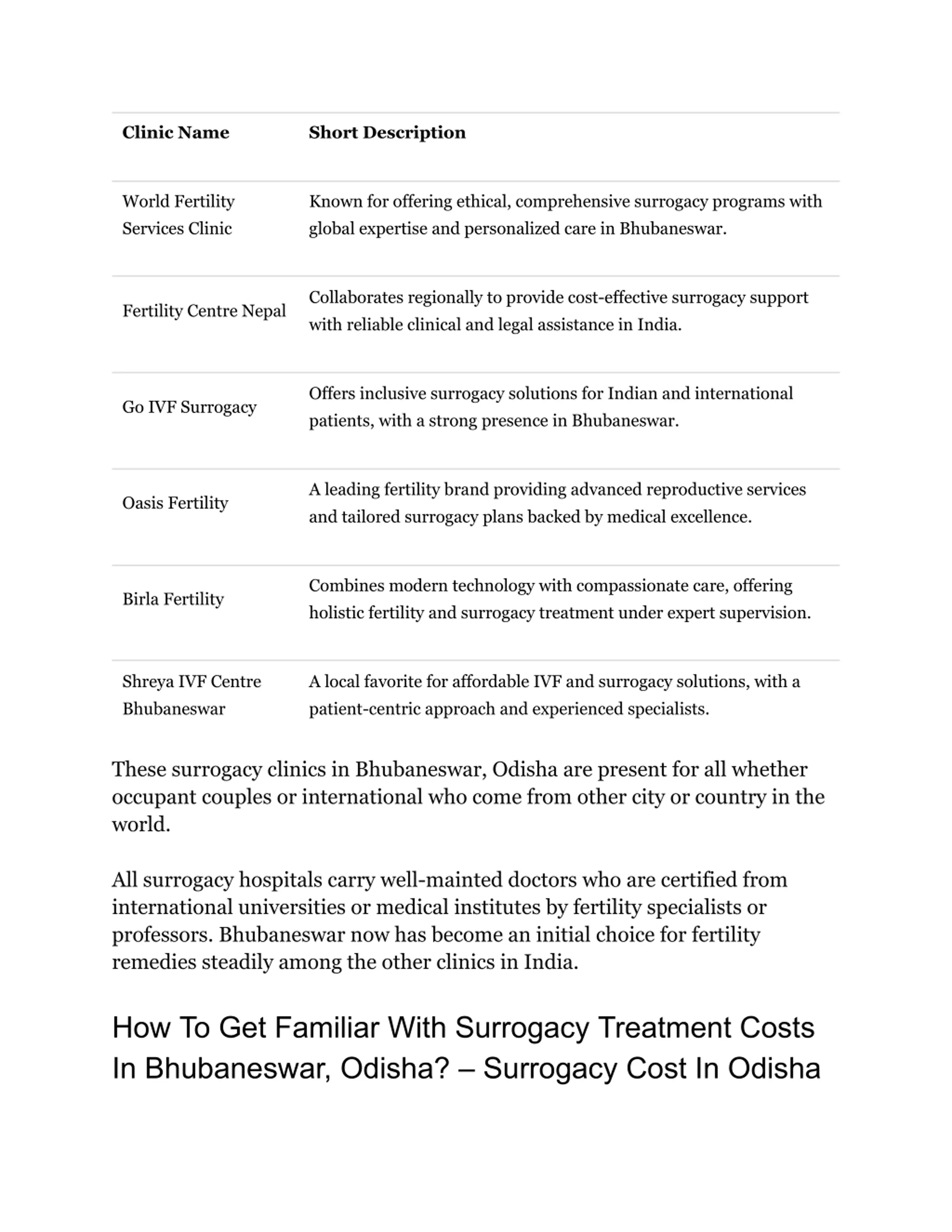 Clinic Name Short Description World Fertility Services Clinic Known for offering ethical, comprehensive surrogacy programs with global expertise and personalized care in Bhubaneswar. Collaborates regionally to provide cost-effective surrogacy support with reliable clinical and legal assistance in India. Fertility Centre Nepal Offers inclusive surrogacy solutions for Indian and international patients, with a strong presence in Bhubaneswar. Go IVF Surrogacy A leading fertility brand providing advanced reproductive services and tailored surrogacy plans backed by medical excellence. Oasis Fertility Combines modern technology with compassionate care, offering holistic fertility and surrogacy treatment under expert supervision. Birla Fertility Shreya IVF Centre Bhubaneswar A local favorite for affordable IVF and surrogacy solutions, with a patient-centric approach and experienced specialists. These surrogacy clinics in Bhubaneswar, Odisha are present for all whether occupant couples or international who come from other city or country in the world. All surrogacy hospitals carry well-mainted doctors who are certified from international universities or medical institutes by fertility specialists or professors. Bhubaneswar now has become an initial choice for fertility remedies steadily among the other clinics in India. How To Get Familiar With Surrogacy Treatment Costs In Bhubaneswar, Odisha? Surrogacy Cost In Odisha