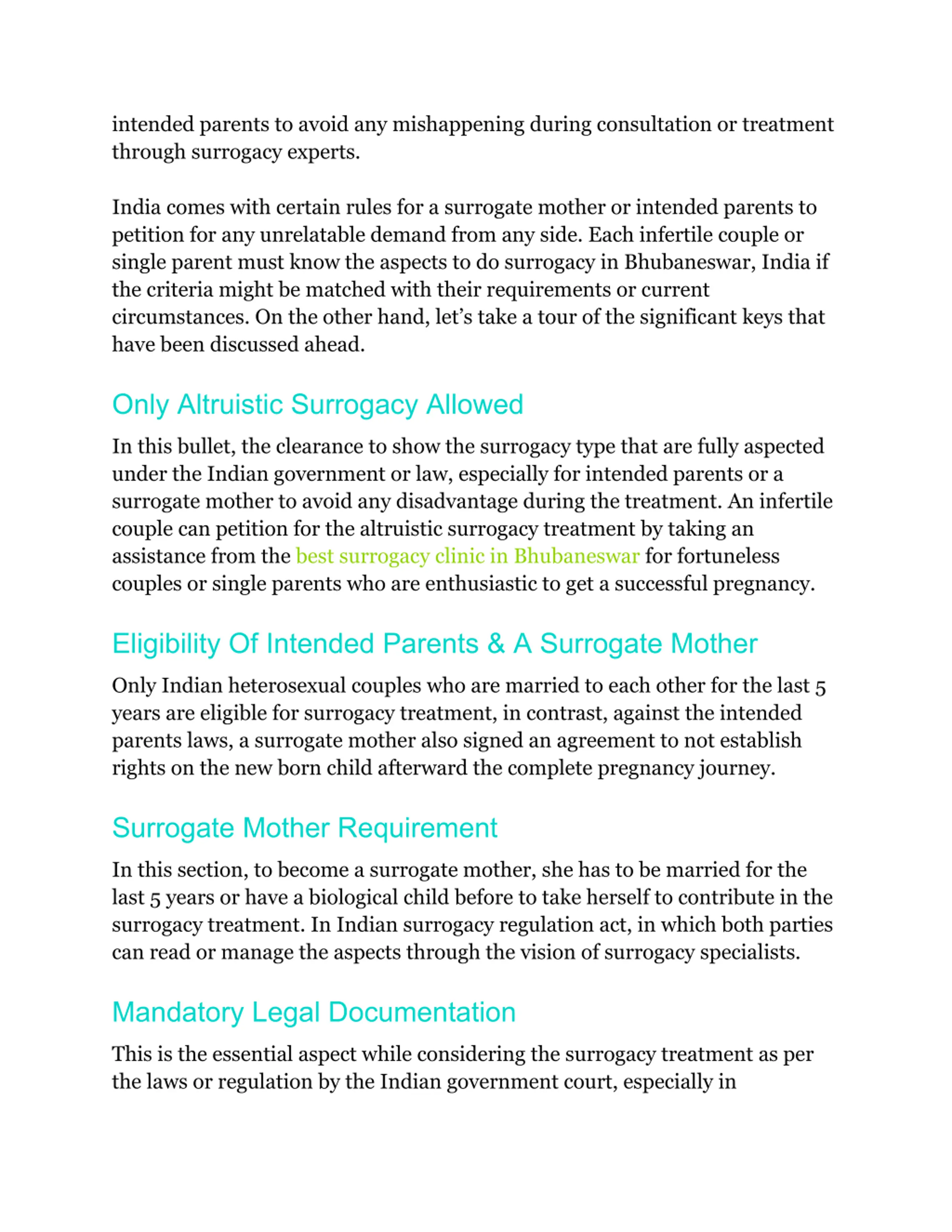 intended parents to avoid any mishappening during consultation or treatment through surrogacy experts. India comes with certain rules for a surrogate mother or intended parents to petition for any unrelatable demand from any side. Each infertile couple or single parent must know the aspects to do surrogacy in Bhubaneswar, India if the criteria might be matched with their requirements or current circumstances. On the other hand, let s take a tour of the significant keys that have been discussed ahead. Only Altruistic Surrogacy Allowed In this bullet, the clearance to show the surrogacy type that are fully aspected under the Indian government or law, especially for intended parents or a surrogate mother to avoid any disadvantage during the treatment. An infertile couple can petition for the altruistic surrogacy treatment by taking an assistance from the best surrogacy clinic in Bhubaneswar for fortuneless couples or single parents who are enthusiastic to get a successful pregnancy. Eligibility Of Intended Parents & A Surrogate Mother Only Indian heterosexual couples who are married to each other for the last 5 years are eligible for surrogacy treatment, in contrast, against the intended parents laws, a surrogate mother also signed an agreement to not establish rights on the new born child afterward the complete pregnancy journey. Surrogate Mother Requirement In this section, to become a surrogate mother, she has to be married for the last 5 years or have a biological child before to take herself to contribute in the surrogacy treatment. In Indian surrogacy regulation act, in which both parties can read or manage the aspects through the vision of surrogacy specialists. Mandatory Legal Documentation This is the essential aspect while considering the surrogacy treatment as per the laws or regulation by the Indian government court, especially in