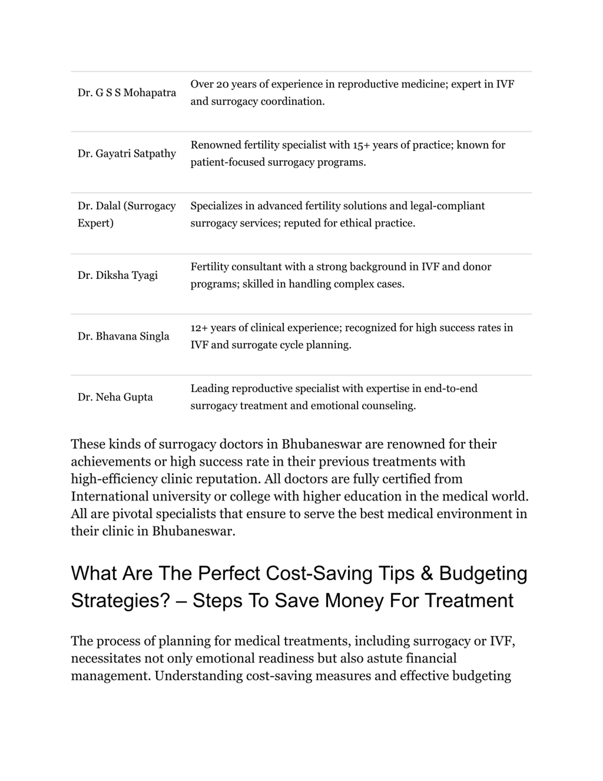 Over 20 years of experience in reproductive medicine; expert in IVF and surrogacy coordination. Dr. G S S Mohapatra Renowned fertility specialist with 15+ years of practice; known for patient-focused surrogacy programs. Dr. Gayatri Satpathy Dr. Dalal (Surrogacy Expert) Specializes in advanced fertility solutions and legal-compliant surrogacy services; reputed for ethical practice. Fertility consultant with a strong background in IVF and donor programs; skilled in handling complex cases. Dr. Diksha Tyagi 12+ years of clinical experience; recognized for high success rates in IVF and surrogate cycle planning. Dr. Bhavana Singla Leading reproductive specialist with expertise in end-to-end surrogacy treatment and emotional counseling. Dr. Neha Gupta These kinds of surrogacy doctors in Bhubaneswar are renowned for their achievements or high success rate in their previous treatments with high-efficiency clinic reputation. All doctors are fully certified from International university or college with higher education in the medical world. All are pivotal specialists that ensure to serve the best medical environment in their clinic in Bhubaneswar. What Are The Perfect Cost-Saving Tips & Budgeting Strategies? Steps To Save Money For Treatment The process of planning for medical treatments, including surrogacy or IVF, necessitates not only emotional readiness but also astute financial management. Understanding cost-saving measures and effective budgeting