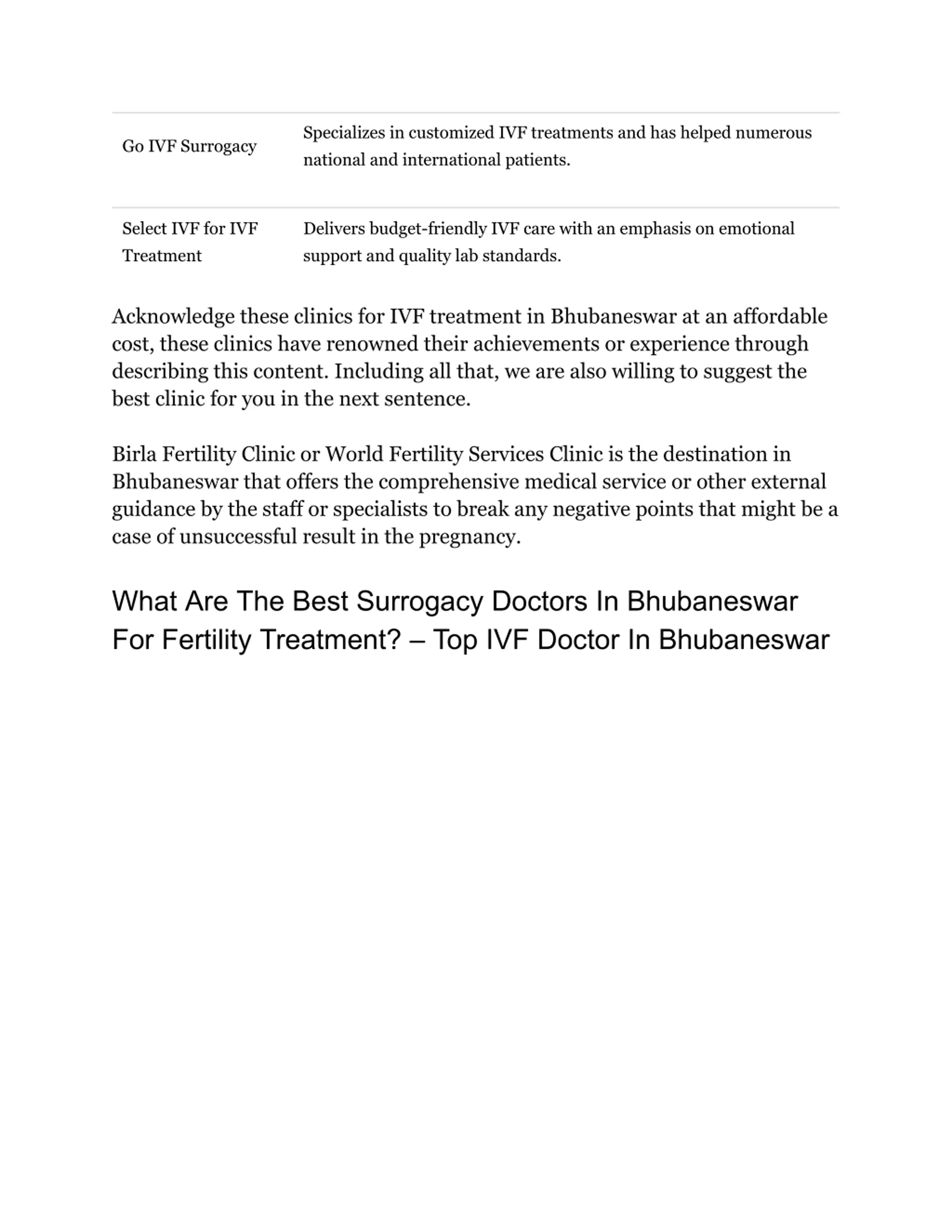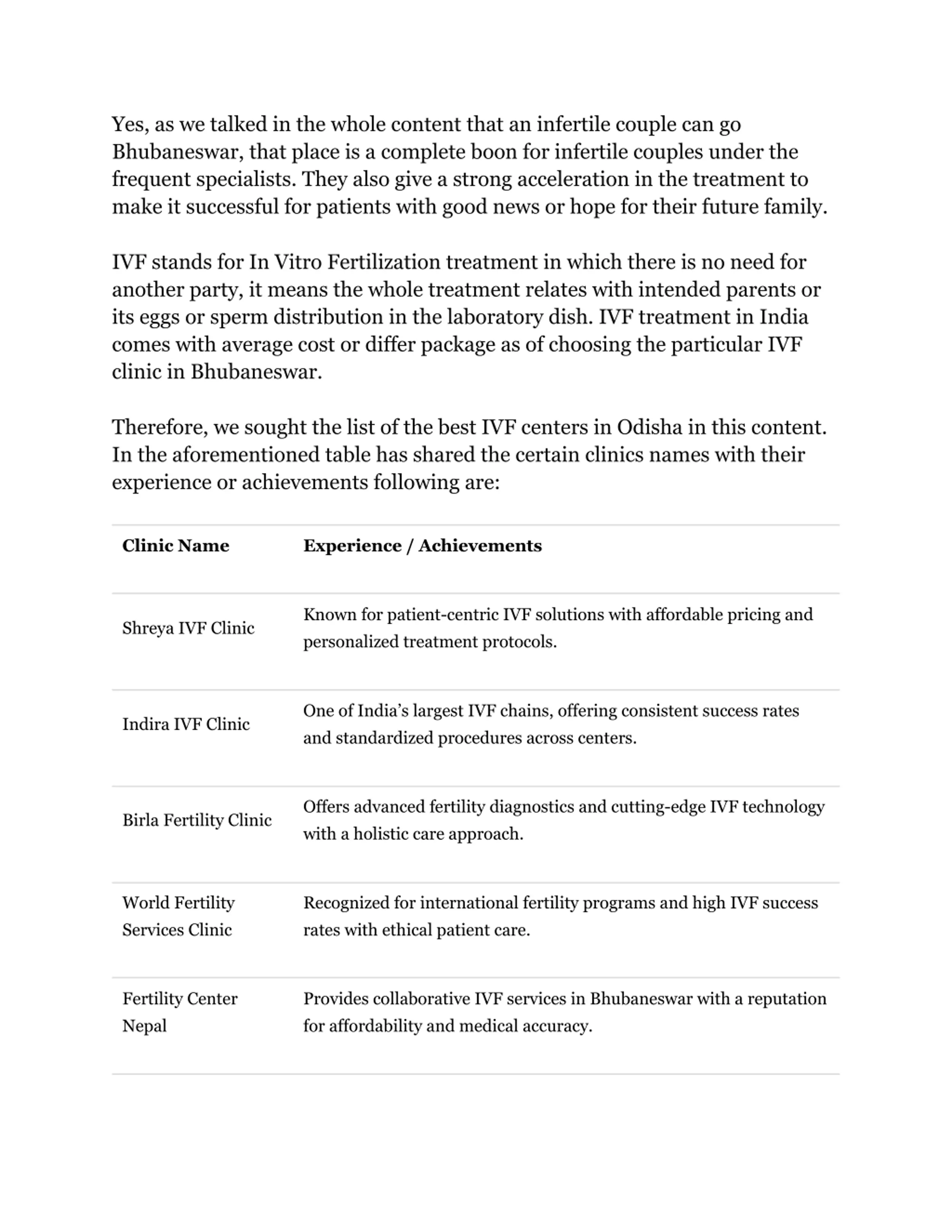 Yes, as we talked in the whole content that an infertile couple can go Bhubaneswar, that place is a complete boon for infertile couples under the frequent specialists. They also give a strong acceleration in the treatment to make it successful for patients with good news or hope for their future family. IVF stands for In Vitro Fertilization treatment in which there is no need for another party, it means the whole treatment relates with intended parents or its eggs or sperm distribution in the laboratory dish. IVF treatment in India comes with average cost or differ package as of choosing the particular IVF clinic in Bhubaneswar. Therefore, we sought the list of the best IVF centers in Odisha in this content. In the aforementioned table has shared the certain clinics names with their experience or achievements following are: Clinic Name Experience / Achievements Known for patient-centric IVF solutions with affordable pricing and personalized treatment protocols. Shreya IVF Clinic One of India s largest IVF chains, offering consistent success rates and standardized procedures across centers. Indira IVF Clinic Offers advanced fertility diagnostics and cutting-edge IVF technology with a holistic care approach. Birla Fertility Clinic World Fertility Services Clinic Recognized for international fertility programs and high IVF success rates with ethical patient care. Fertility Center Nepal Provides collaborative IVF services in Bhubaneswar with a reputation for affordability and medical accuracy.