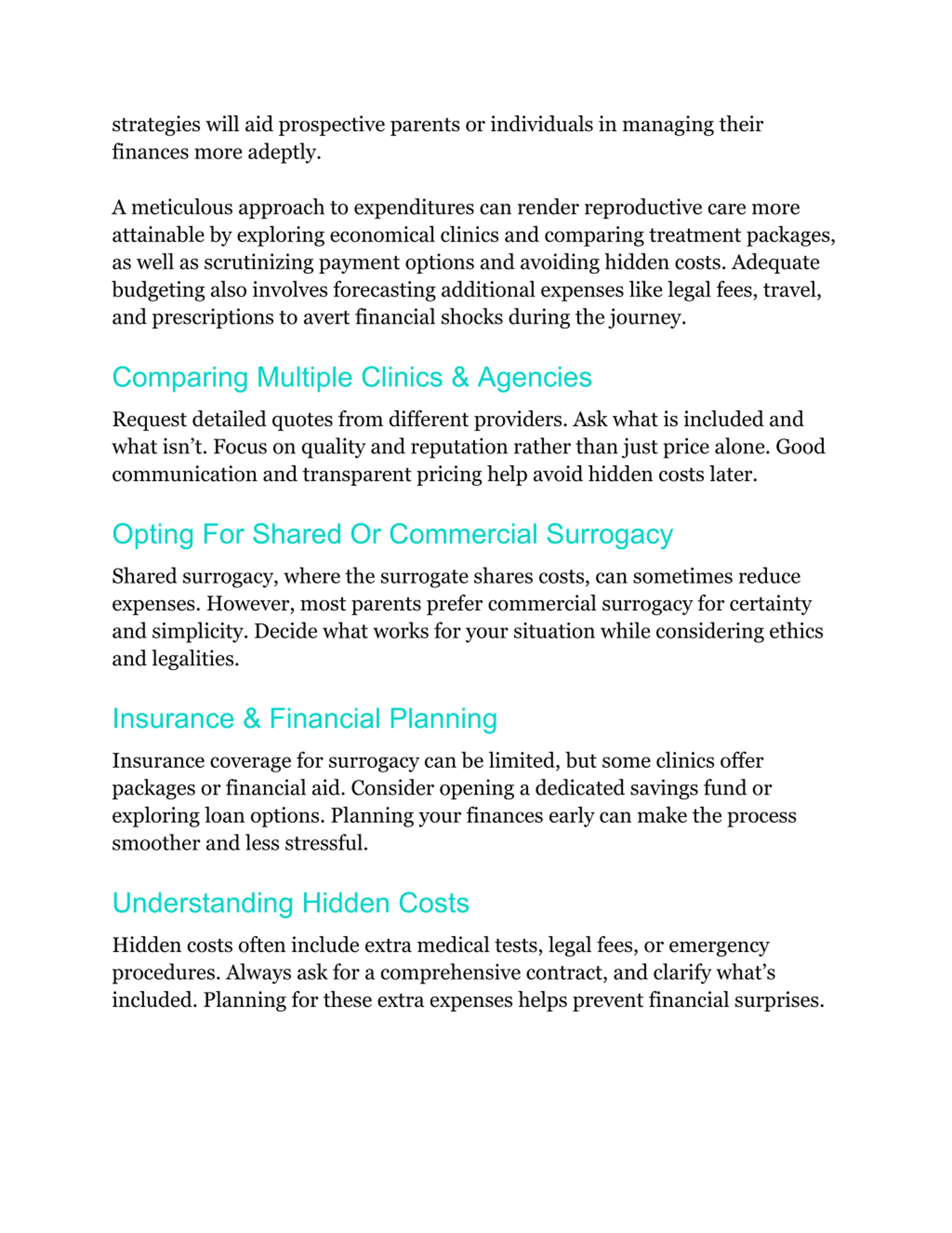 strategies will aid prospective parents or individuals in managing their finances more adeptly. A meticulous approach to expenditures can render reproductive care more attainable by exploring economical clinics and comparing treatment packages, as well as scrutinizing payment options and avoiding hidden costs. Adequate budgeting also involves forecasting additional expenses like legal fees, travel, and prescriptions to avert financial shocks during the journey. Comparing Multiple Clinics & Agencies Request detailed quotes from different providers. Ask what is included and what isn t. Focus on quality and reputation rather than just price alone. Good communication and transparent pricing help avoid hidden costs later. Opting For Shared Or Commercial Surrogacy Shared surrogacy, where the surrogate shares costs, can sometimes reduce expenses. However, most parents prefer commercial surrogacy for certainty and simplicity. Decide what works for your situation while considering ethics and legalities. Insurance & Financial Planning Insurance coverage for surrogacy can be limited, but some clinics offer packages or financial aid. Consider opening a dedicated savings fund or exploring loan options. Planning your finances early can make the process smoother and less stressful. Understanding Hidden Costs Hidden costs often include extra medical tests, legal fees, or emergency procedures. Always ask for a comprehensive contract, and clarify what s included. Planning for these extra expenses helps prevent financial surprises.