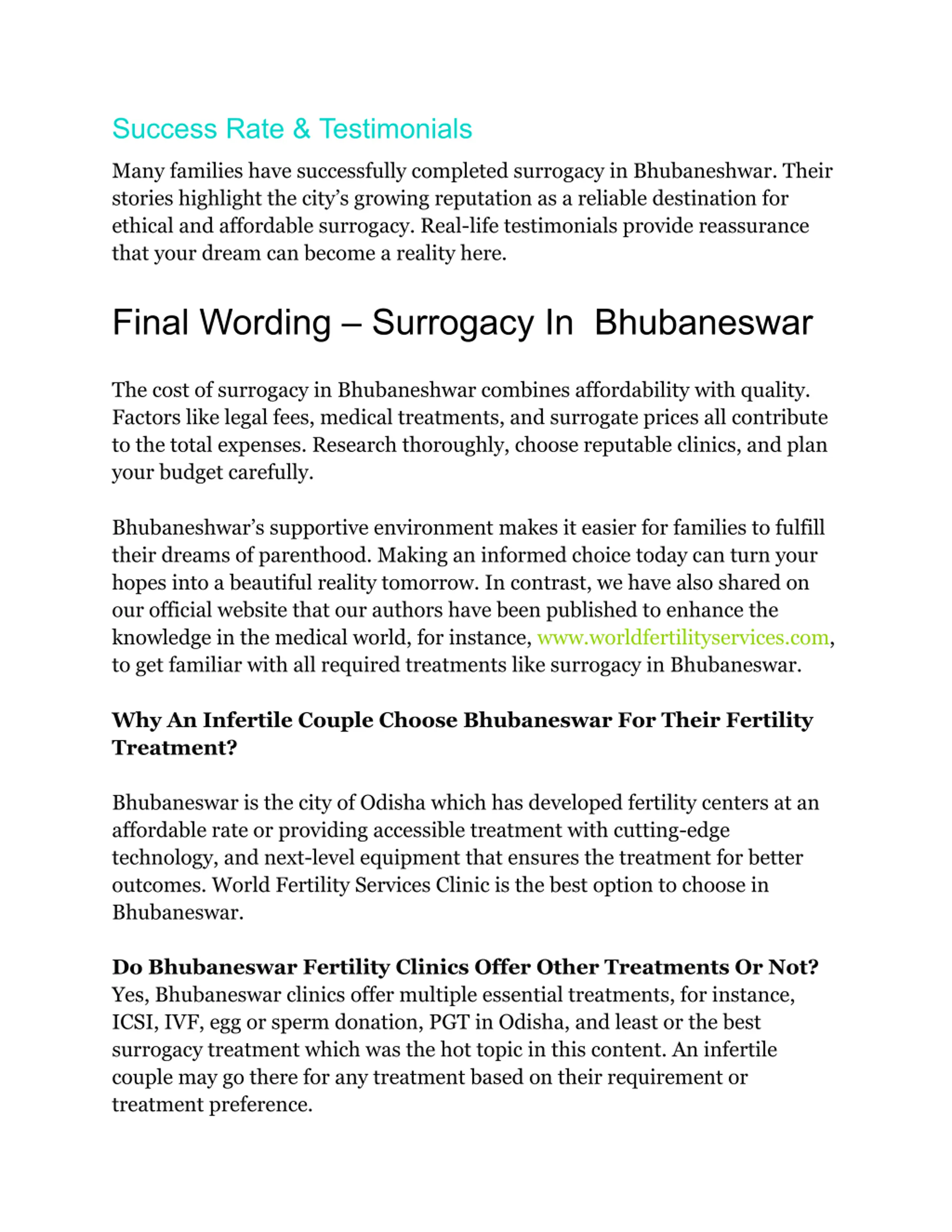 Success Rate & Testimonials Many families have successfully completed surrogacy in Bhubaneshwar. Their stories highlight the city s growing reputation as a reliable destination for ethical and affordable surrogacy. Real-life testimonials provide reassurance that your dream can become a reality here. Final Wording Surrogacy In Bhubaneswar The cost of surrogacy in Bhubaneshwar combines affordability with quality. Factors like legal fees, medical treatments, and surrogate prices all contribute to the total expenses. Research thoroughly, choose reputable clinics, and plan your budget carefully. Bhubaneshwar s supportive environment makes it easier for families to fulfill their dreams of parenthood. Making an informed choice today can turn your hopes into a beautiful reality tomorrow. In contrast, we have also shared on our official website that our authors have been published to enhance the knowledge in the medical world, for instance, www.worldfertilityservices.com, to get familiar with all required treatments like surrogacy in Bhubaneswar. Why An Infertile Couple Choose Bhubaneswar For Their Fertility Treatment? Bhubaneswar is the city of Odisha which has developed fertility centers at an affordable rate or providing accessible treatment with cutting-edge technology, and next-level equipment that ensures the treatment for better outcomes. World Fertility Services Clinic is the best option to choose in Bhubaneswar. Do Bhubaneswar Fertility Clinics Offer Other Treatments Or Not? Yes, Bhubaneswar clinics offer multiple essential treatments, for instance, ICSI, IVF, egg or sperm donation, PGT in Odisha, and least or the best surrogacy treatment which was the hot topic in this content. An infertile couple may go there for any treatment based on their requirement or treatment preference.
