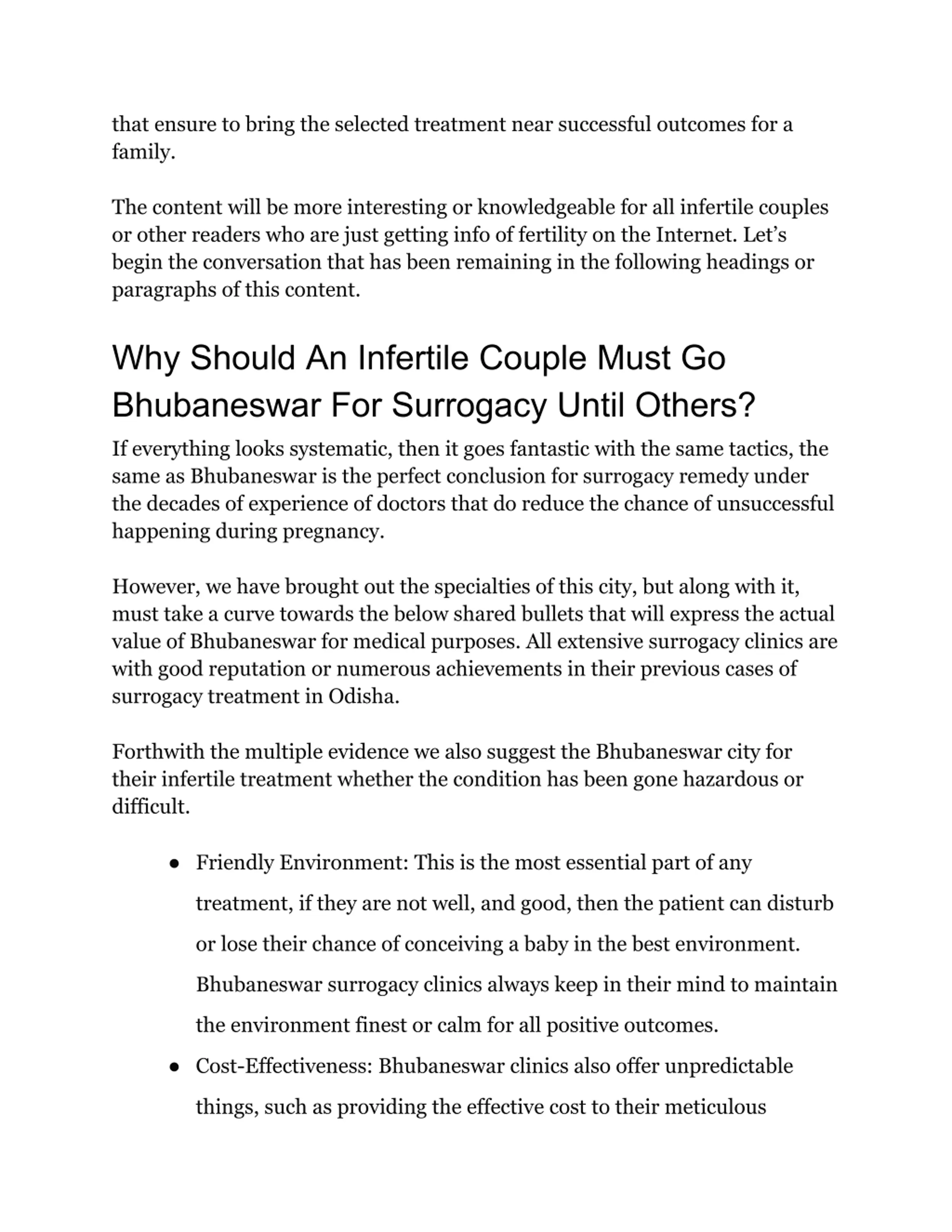 that ensure to bring the selected treatment near successful outcomes for a family. The content will be more interesting or knowledgeable for all infertile couples or other readers who are just getting info of fertility on the Internet. Let s begin the conversation that has been remaining in the following headings or paragraphs of this content. Why Should An Infertile Couple Must Go Bhubaneswar For Surrogacy Until Others? If everything looks systematic, then it goes fantastic with the same tactics, the same as Bhubaneswar is the perfect conclusion for surrogacy remedy under the decades of experience of doctors that do reduce the chance of unsuccessful happening during pregnancy. However, we have brought out the specialties of this city, but along with it, must take a curve towards the below shared bullets that will express the actual value of Bhubaneswar for medical purposes. All extensive surrogacy clinics are with good reputation or numerous achievements in their previous cases of surrogacy treatment in Odisha. Forthwith the multiple evidence we also suggest the Bhubaneswar city for their infertile treatment whether the condition has been gone hazardous or difficult. Friendly Environment: This is the most essential part of any treatment, if they are not well, and good, then the patient can disturb or lose their chance of conceiving a baby in the best environment. Bhubaneswar surrogacy clinics always keep in their mind to maintain the environment finest or calm for all positive outcomes. Cost-Effectiveness: Bhubaneswar clinics also offer unpredictable things, such as providing the effective cost to their meticulous