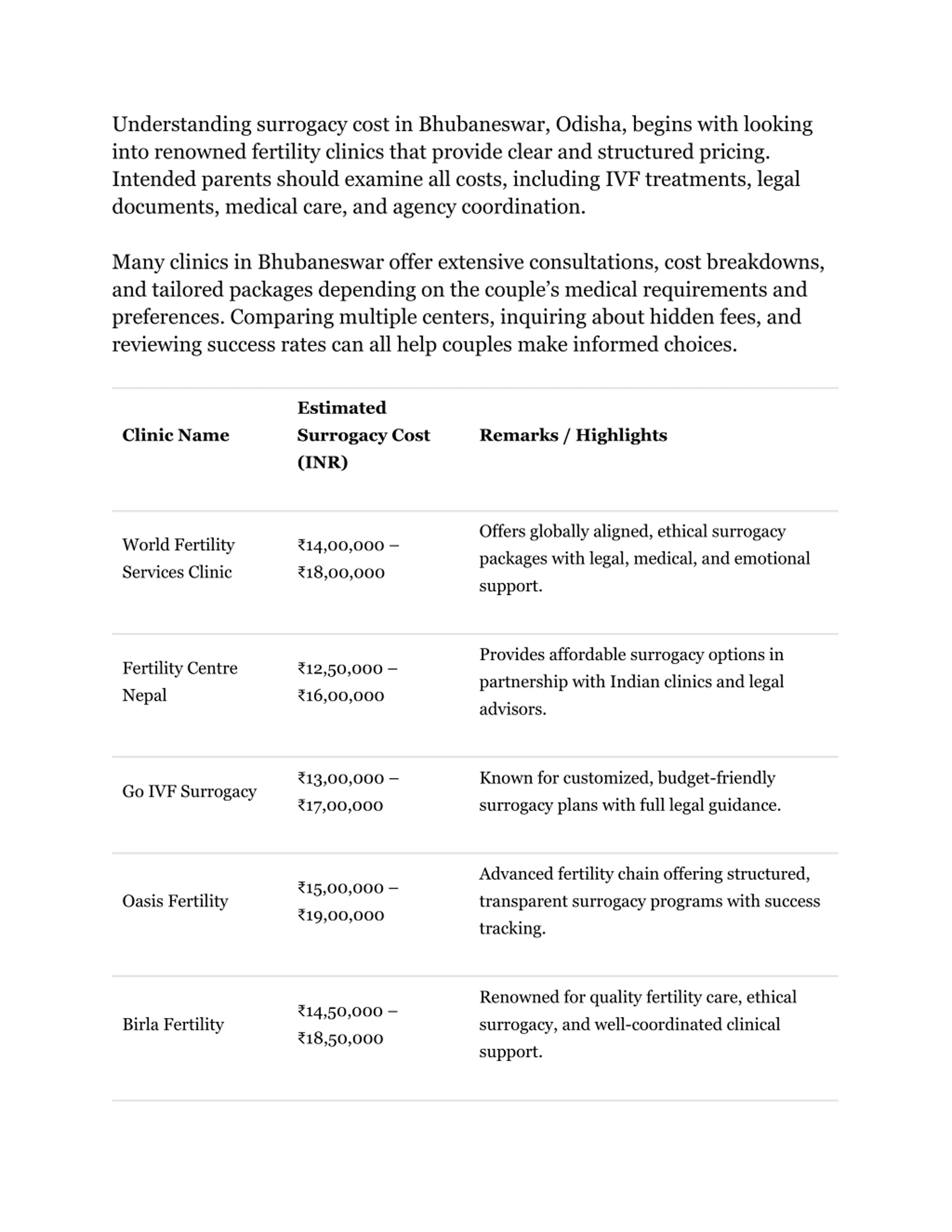 Understanding surrogacy cost in Bhubaneswar, Odisha, begins with looking into renowned fertility clinics that provide clear and structured pricing. Intended parents should examine all costs, including IVF treatments, legal documents, medical care, and agency coordination. Many clinics in Bhubaneswar offer extensive consultations, cost breakdowns, and tailored packages depending on the couple s medical requirements and preferences. Comparing multiple centers, inquiring about hidden fees, and reviewing success rates can all help couples make informed choices. Estimated Surrogacy Cost (INR) Clinic Name Remarks / Highlights Offers globally aligned, ethical surrogacy packages with legal, medical, and emotional support. World Fertility Services Clinic 14,00,000 18,00,000 Provides affordable surrogacy options in partnership with Indian clinics and legal advisors. Fertility Centre Nepal 12,50,000 16,00,000 13,00,000 17,00,000 Known for customized, budget-friendly surrogacy plans with full legal guidance. Go IVF Surrogacy Advanced fertility chain offering structured, transparent surrogacy programs with success tracking. 15,00,000 19,00,000 Oasis Fertility Renowned for quality fertility care, ethical surrogacy, and well-coordinated clinical support. 14,50,000 18,50,000 Birla Fertility