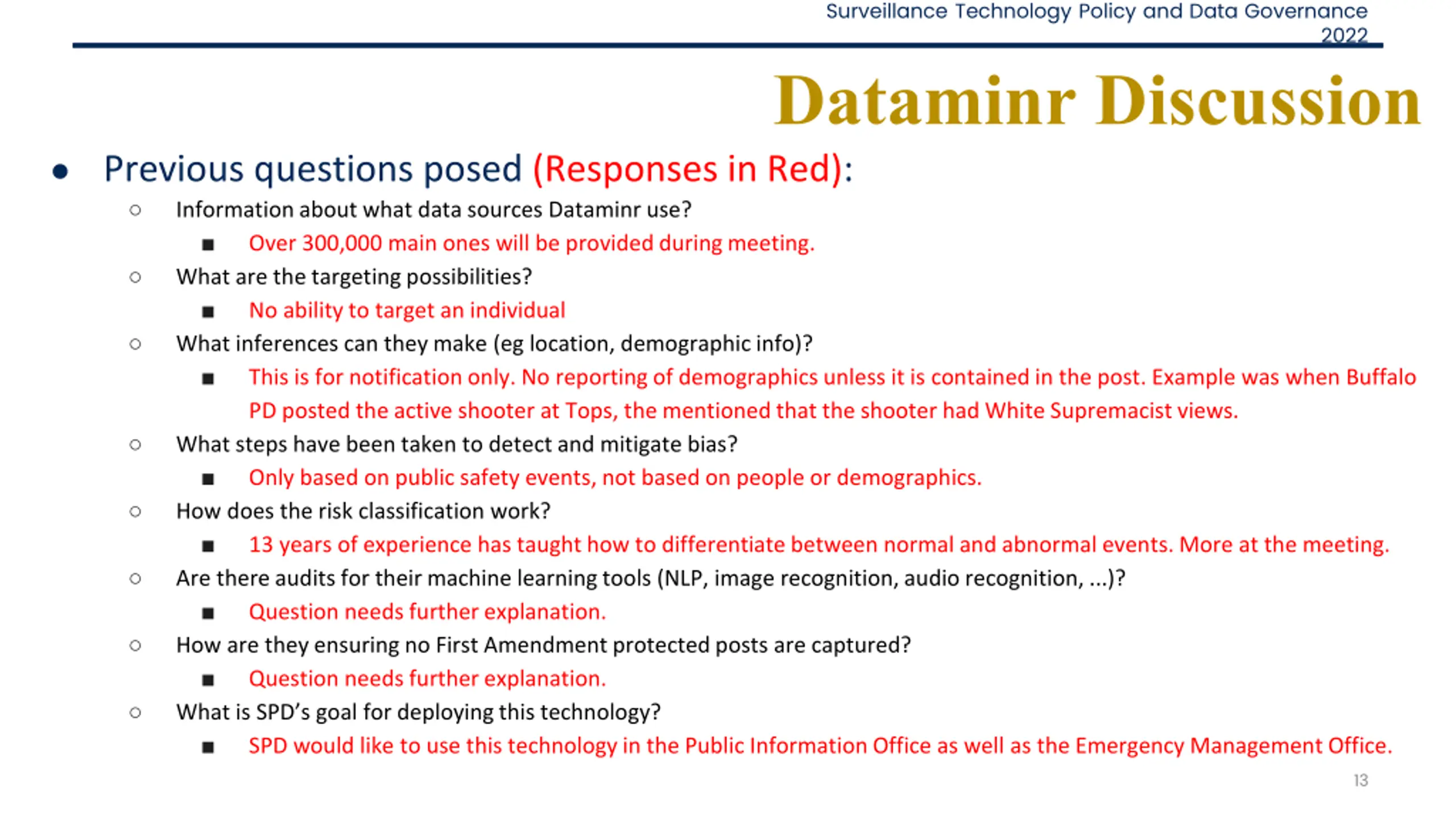 Surveillance Technology Policy and Data Governance Dataminr Discussion 2022 Previous questions posed (Responses in Red): Information about what data sources Dataminr use? Over 300,000 main ones will be provided during meeting. What are the targeting possibilities? No ability to target an individual What inferences can they make (eg location, demographic info)? This is for notification only. No reporting of demographics unless it is contained in the post. Example was when Buffalo PD posted the active shooter at Tops, the mentioned that the shooter had White Supremacist views. What steps have been taken to detect and mitigate bias? Only based on public safety events, not based on people or demographics. How does the risk classification work? 13 years of experience has taught how to differentiate between normal and abnormal events. More at the meeting. Are there audits for their machine learning tools (NLP, image recognition, audio recognition, ...)? Question needs further explanation. How are they ensuring no First Amendment protected posts are captured? Question needs further explanation. What is SPD s goal for deploying this technology? SPD would like to use this technology in the Public Information Office as well as the Emergency Management Office. 13