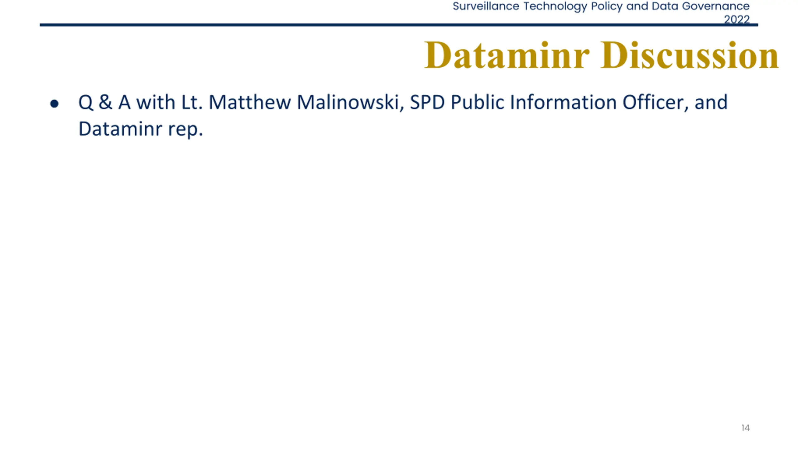 Surveillance Technology Policy and Data Governance Dataminr Discussion 2022 Q & A with Lt. Matthew Malinowski, SPD Public Information Officer, and Dataminr rep. 14