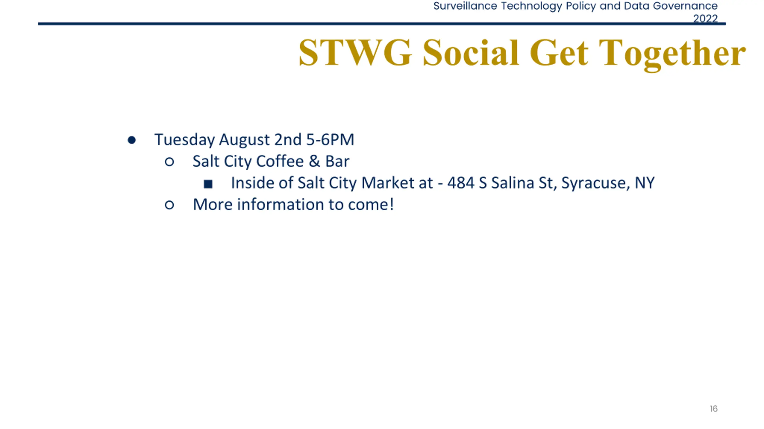 Surveillance Technology Policy and Data Governance STWG Social Get Together 2022 Tuesday August 2nd 5-6PM Salt City Coffee & Bar Inside of Salt City Market at - 484 S Salina St, Syracuse, NY More information to come! 16