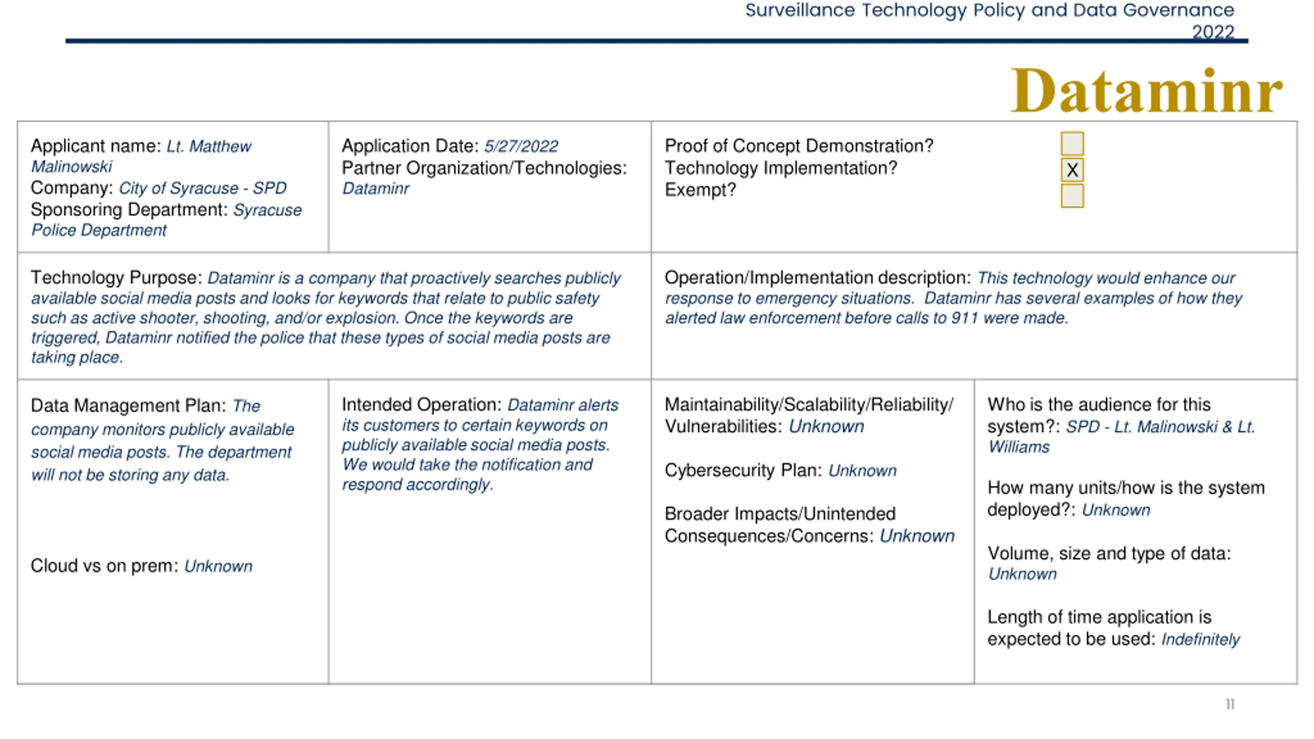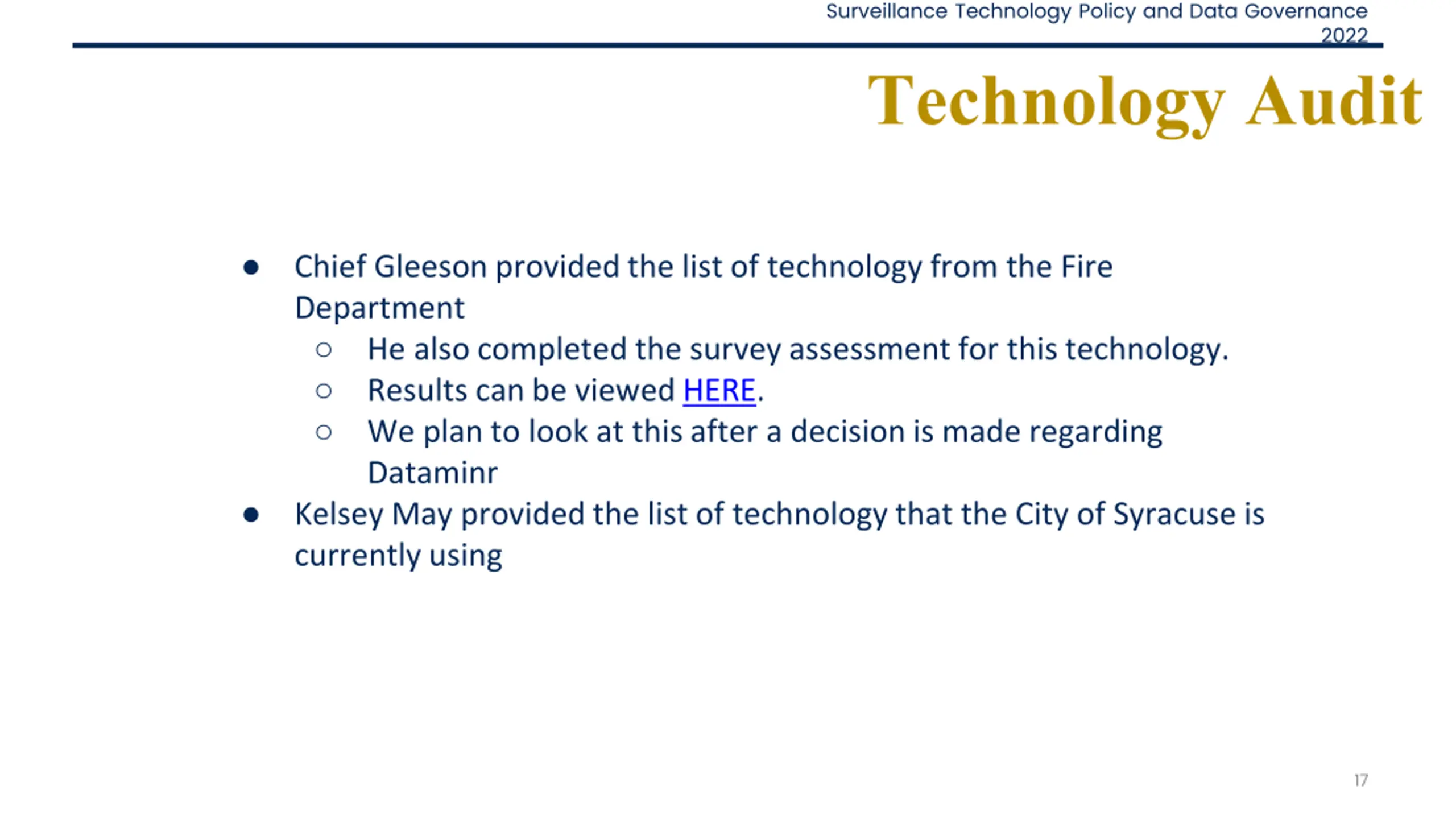 Surveillance Technology Policy and Data Governance Technology Audit 2022 Chief Gleeson provided the list of technology from the Fire Department He also completed the survey assessment for this technology. Results can be viewed HERE. We plan to look at this after a decision is made regarding Dataminr Kelsey May provided the list of technology that the City of Syracuse is currently using 17