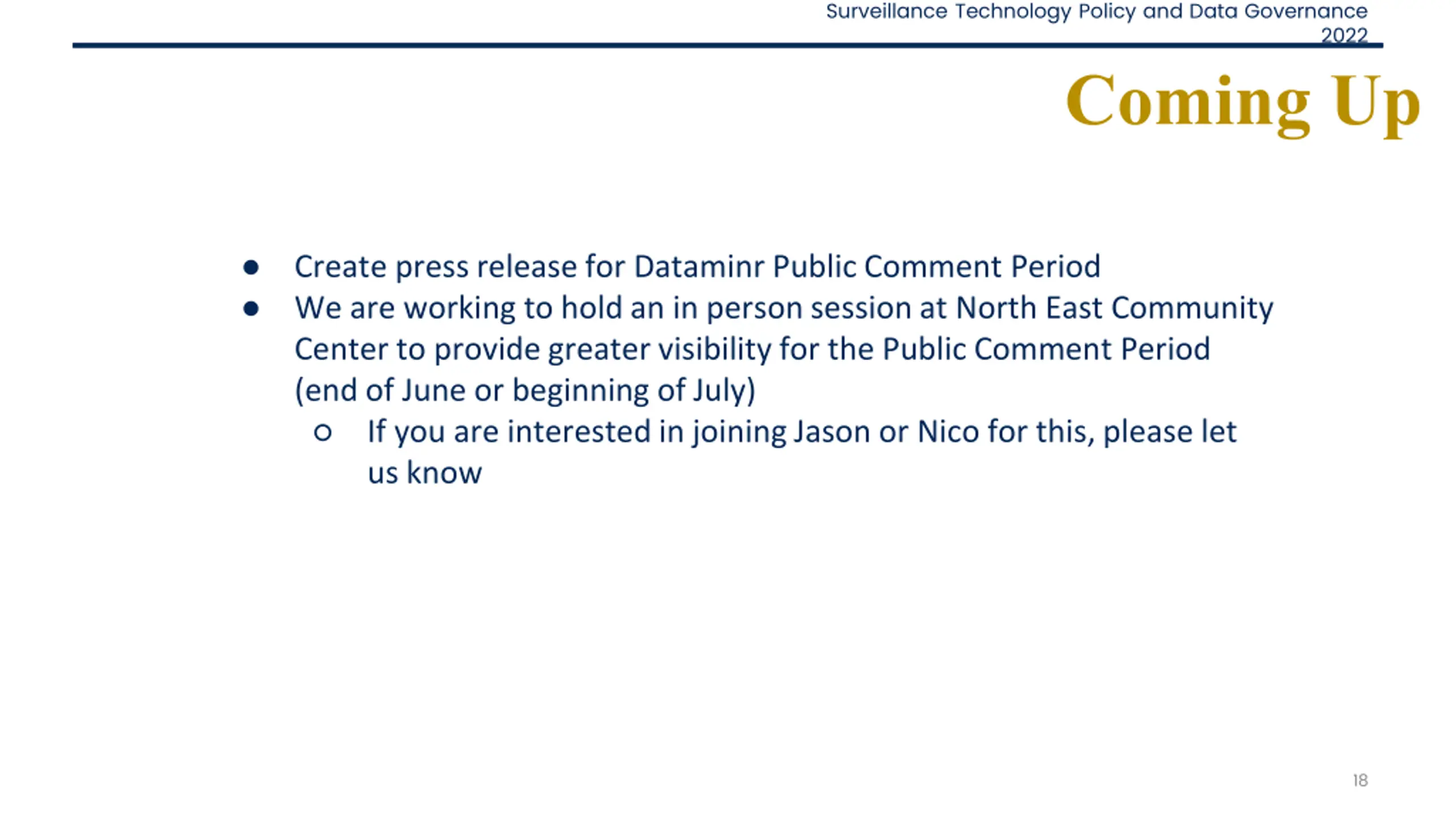 Surveillance Technology Policy and Data Governance Coming Up 2022 Create press release for Dataminr Public Comment Period We are working to hold an in person session at North East Community Center to provide greater visibility for the Public Comment Period (end of June or beginning of July) If you are interested in joining Jason or Nico for this, please let us know 18
