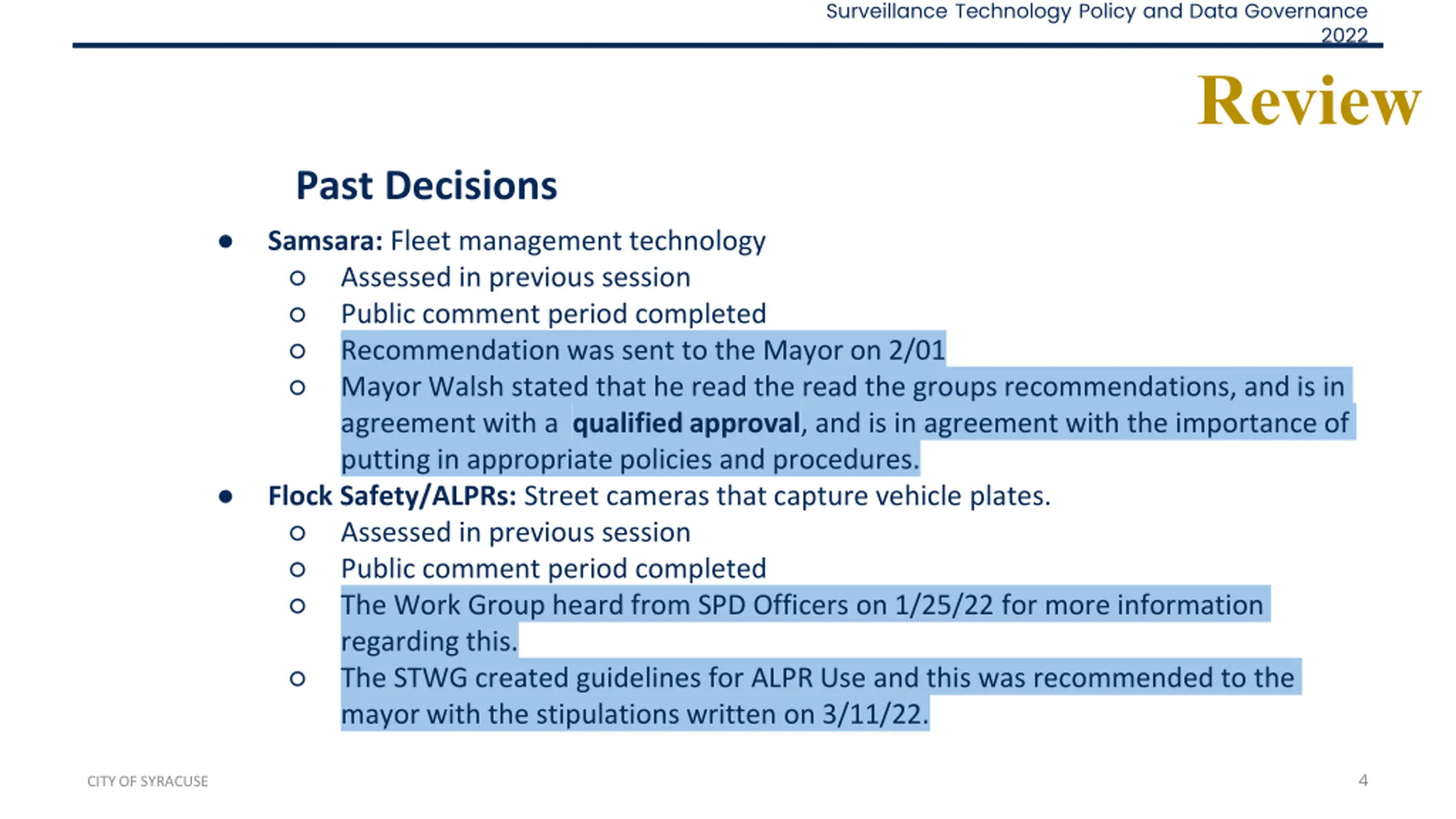 Surveillance Technology Policy and Data Governance 2022 Review Past Decisions Cyclomedia: Right of Way Imaging Public comment period completed Recommendation was sent to the Mayor on 5/07/22 Mayor Walsh stated: I have reviewed the STWG s recommendation and I am in agreement with it. Current Decisions Dataminr: Social Media monitoring of violent posts. Discussion continuing today Public comment period to open right after 5 CITY OF SYRACUSE