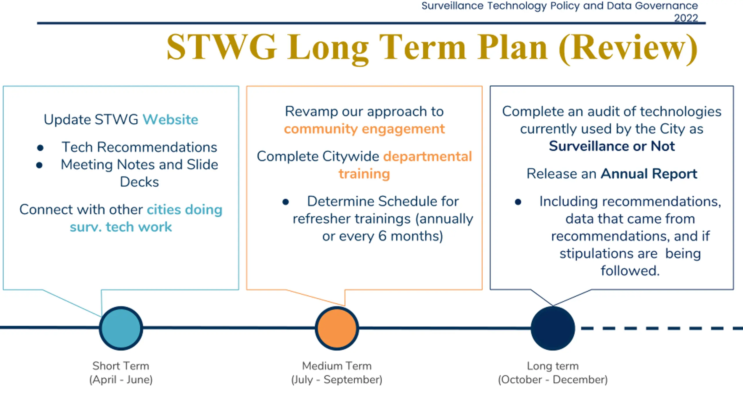 Surveillance Technology Policy and Data Governance 2022 STWG Long Term Plan (Review) Short Term (April - June) Medium Term (July - September) Long term (October - December)