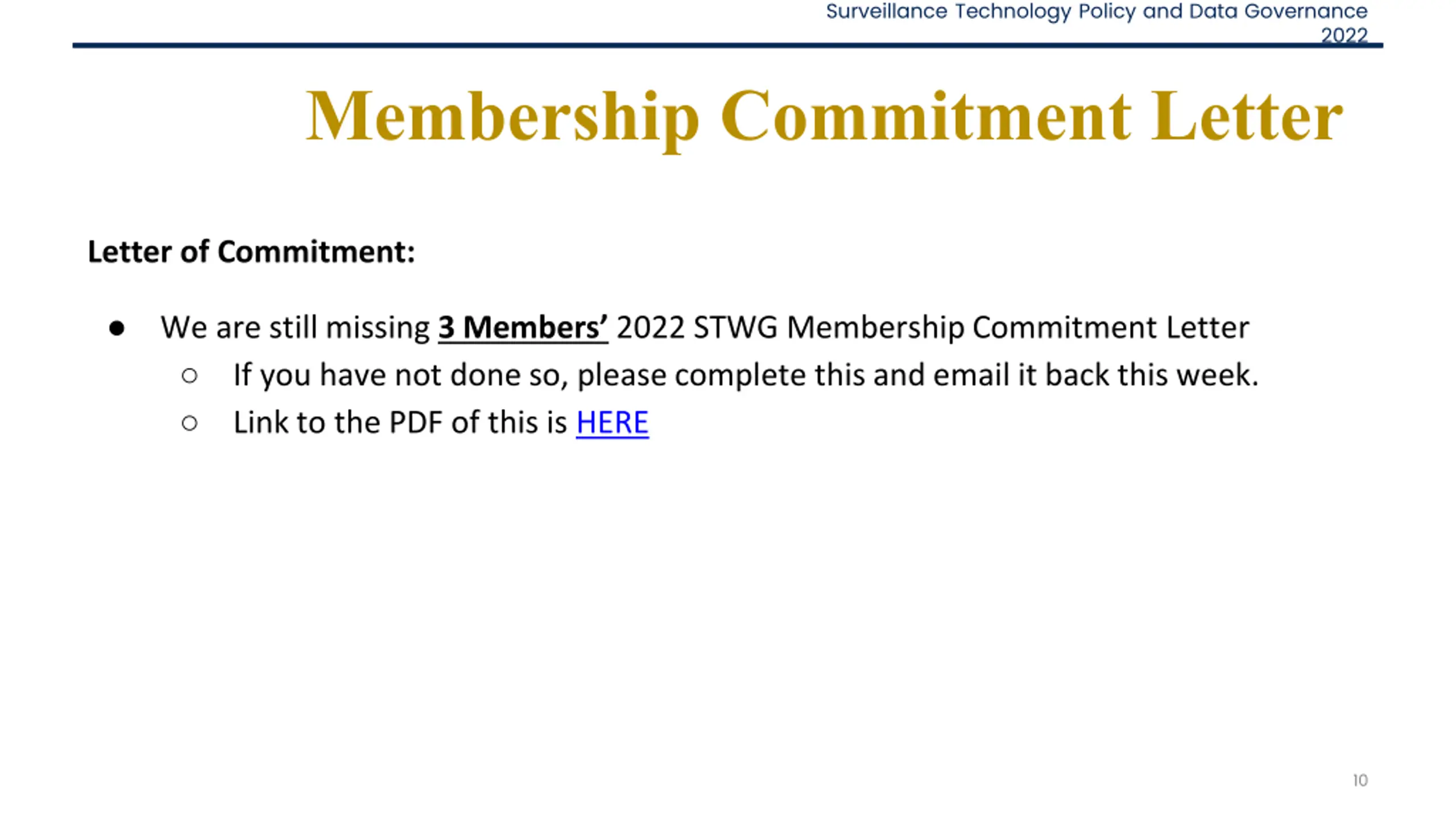 Surveillance Technology Policy and Data Governance 2022 Membership Commitment Letter Letter of Commitment: We are still missing 3 Members 2022 STWG Membership Commitment Letter If you have not done so, please complete this and email it back this week. Link to the PDF of this is HERE 10